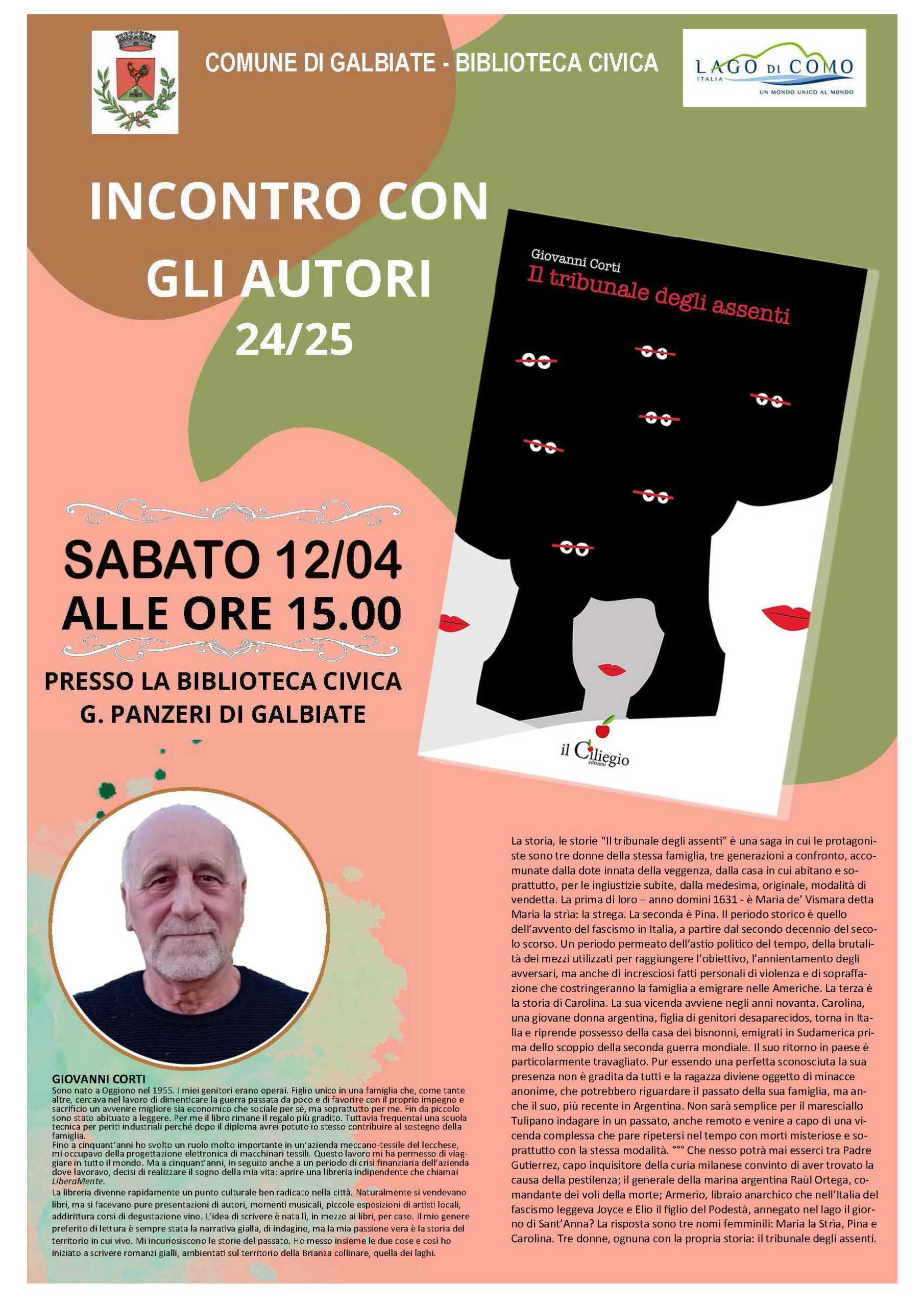 Il Comune di Galbiate e la Biblioteca civica di Galbiate invitano gli abitanti e i frequentatori del Parco alla presentazione del libro “Il tribunale degli assenti” di Giovanni Corti, all’interno della rassegna letteraria “Incontro con gli autori”,