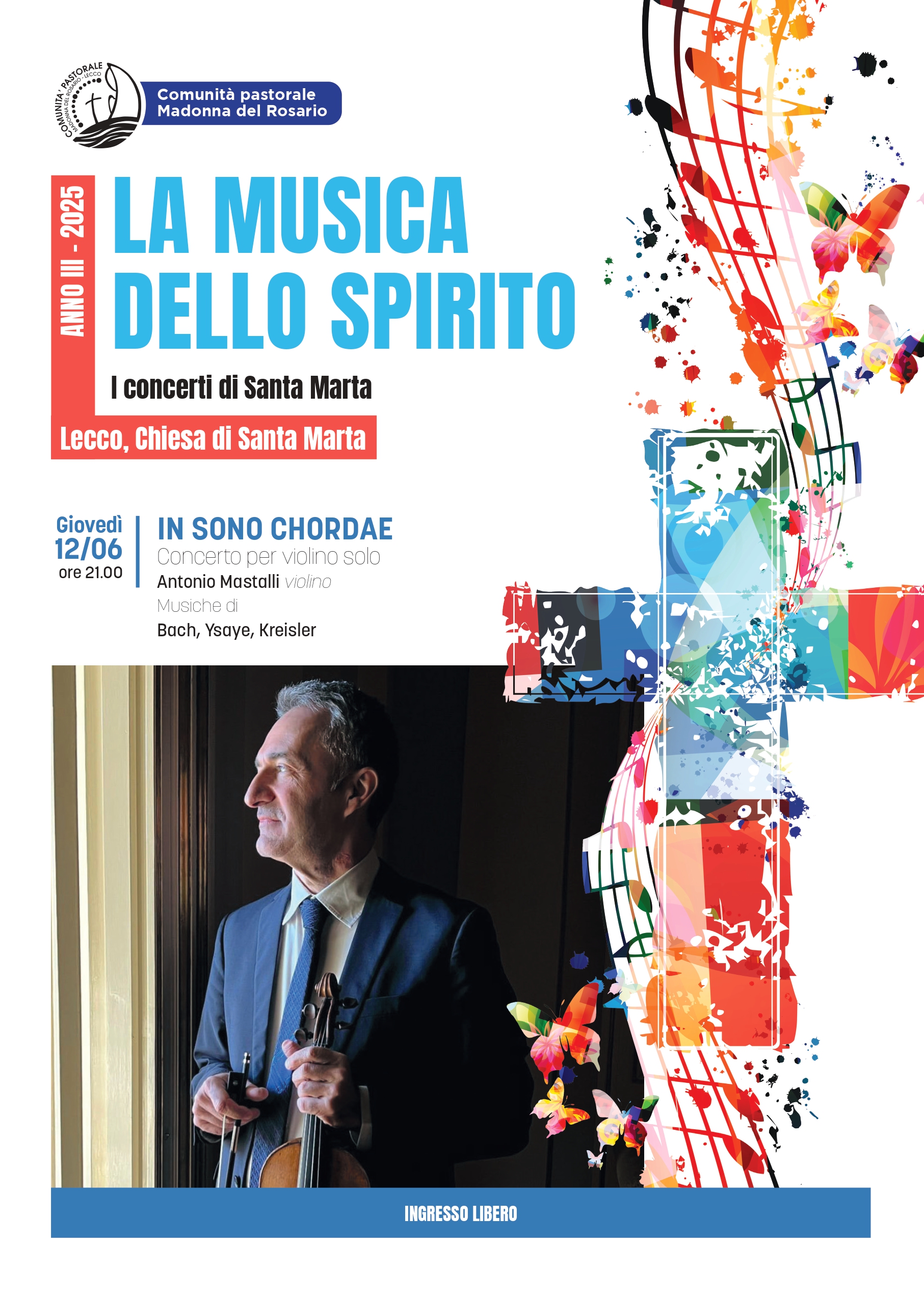 Proseguono i “Concerti di Santa Marta” Giovedì 12 giugno alle 21:00 presso la Chiesa di Santa Marta, con “In sono chordae”, concerto per violino con Antonio Mastalli e musiche di Bach, Ysaye, Kreisler.