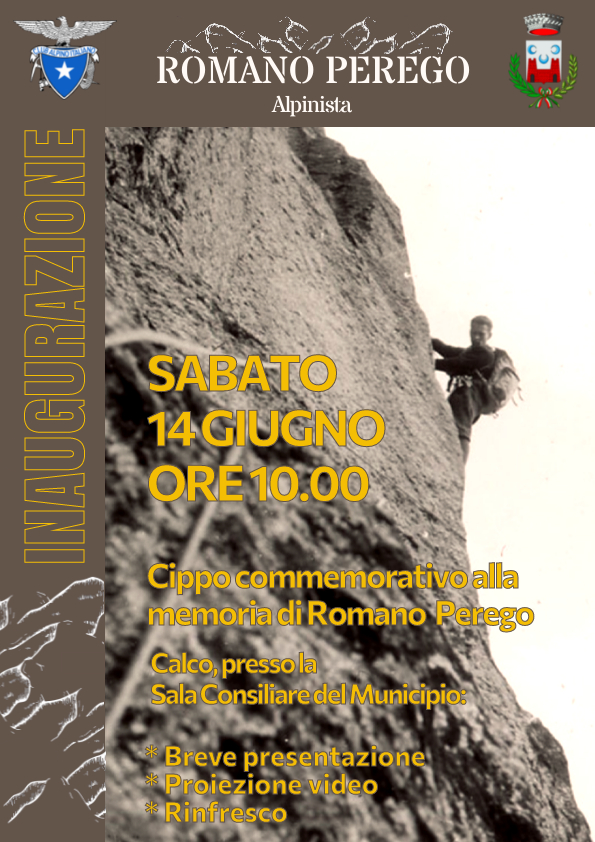 Sabato 14 Giugno alle 10.00 il Comune di Calco omaggerà Romano Perego, alpinista, con un cippo commemorativo alla sua memoria. L’evento si svolgerà nella Sala Consiliare del Municipio e sarà costituito da una presentazione, un video celebrativo e un rinfresco per concludere.