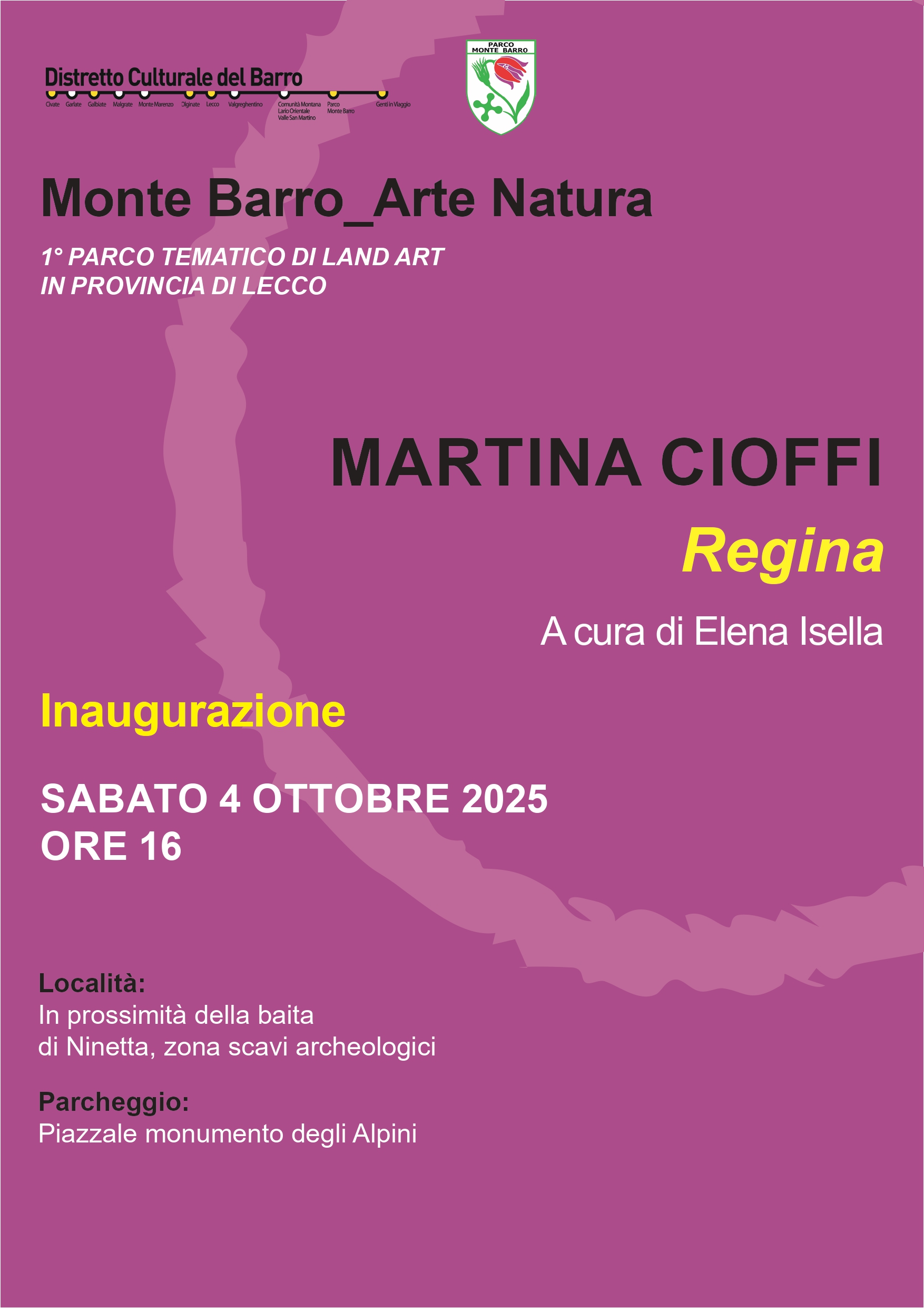 Il Distretto Culturale del Monte Barro e il Parco Monte Barro sono lieti di annunciare un nuovo, affascinante capitolo nel loro racconto di arte e natura: l’inaugurazione dell’installazione Regina, firmata dall’artista Martina Cioffi e curata da Elena Isella. L’opera si troverà in prossimità della Baita di Ninetta, in zona scavi archeologici, sul Monte Barro.