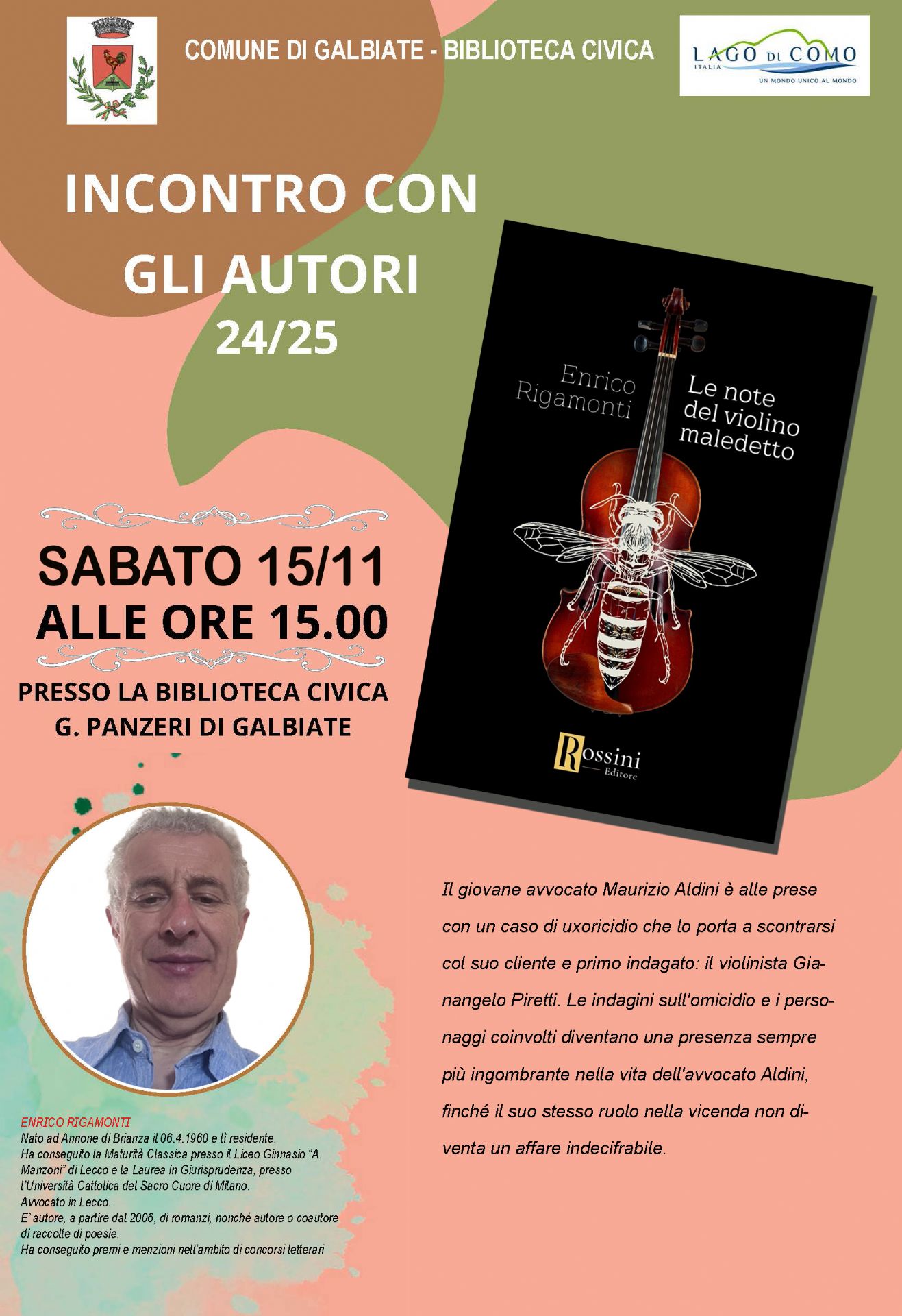 Prosegue il ciclo “Incontro con Autori” promosso dal comune di Galbiate: Sabato 15 Novembre alle 15.00, presso la biblioteca G. Panzeri di Galbiate, Enrico Rigamonti presenterà il suo romanzo Le note del violino maledetto.