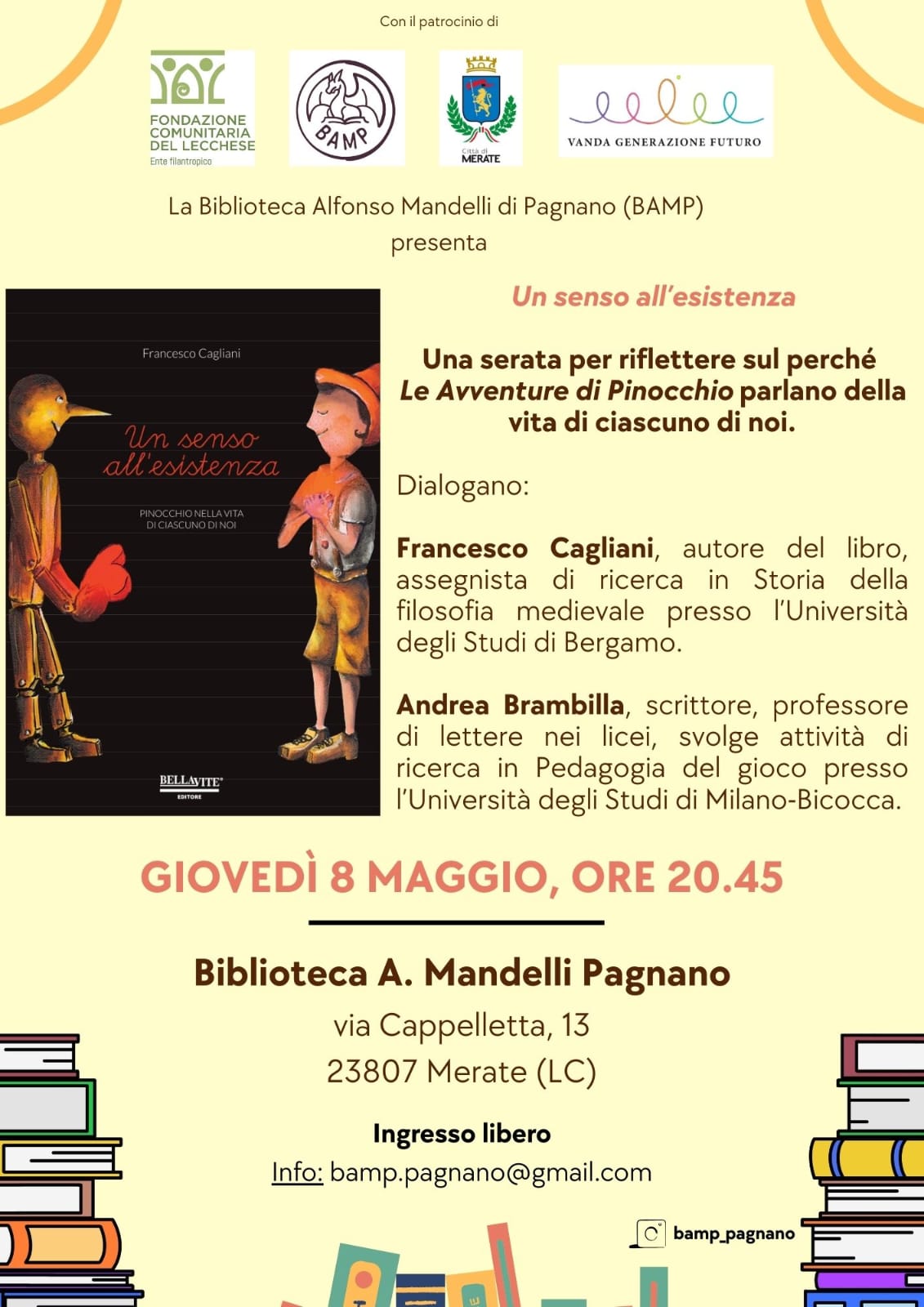 Cagliani intratterrà con Andrea Brambilla, scrittore, professore di lettere nei licei e ricercatore in Pedagogia del gioco, un dialogo intorno al suo libro “Un senso all’esistenza“. Il libro indaga la figura di Pinochio e, in particolare la maniera in cui il libro di Collodi parli in realtà di ciascuno di noi.