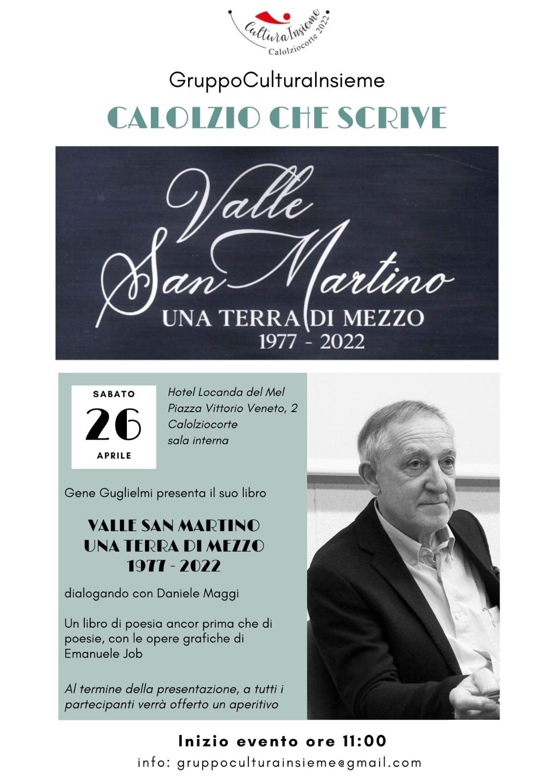 Sabato 26 aprile alle ore 11.00, presso la “locanda del Mel” di Calolziocorte,il gruppo “CulturaInsieme“ propone un incontro con Gene Guglielmi per la presentazione del suo ultimo libro:“Valle San Martino – Una Terra di Mezzo 1977/2022”, dialogando con Daniele Maggi, suo collega e amico.