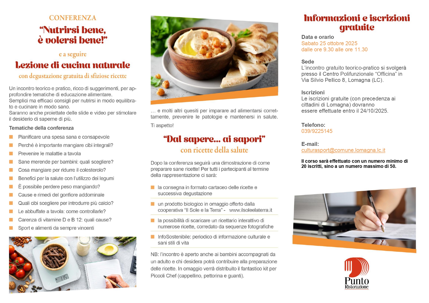 Sabato 25 Ottobre presso il Centro Polifunzionale “Officina” in via Silvio Pellico, 8 a Lomagna, dalle 9.30 alle 11.30, si terrà, in collaborazione con Punto Ristorazione, la conferenza dal titolo “Nutrirsi bene, è volersi bene!” . A seguire ci sarà una lezione di cucina naturale con degustazione gratuita di sfiziose ricette.