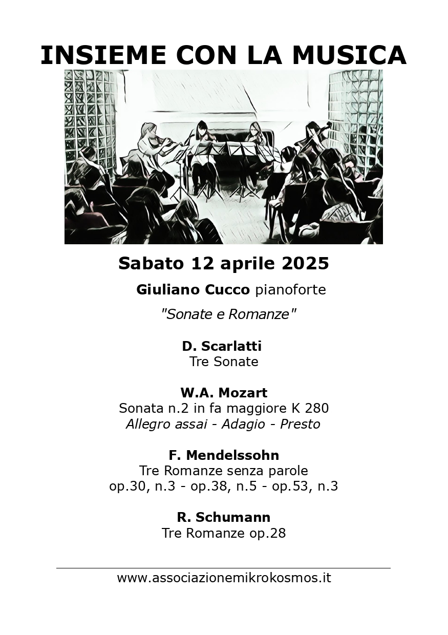 Giuliano Cucco, pianista, suonerà Sonate e Romanze“, un concerto che comprende: “Tre Sonate” di D. Scarlatti, la Sonata n.2 in fa maggiore K 280 di Mozart, Tre Romanze senza parole di F. Mendelssohn e Tre Romanze op.28 di R. Schumann.