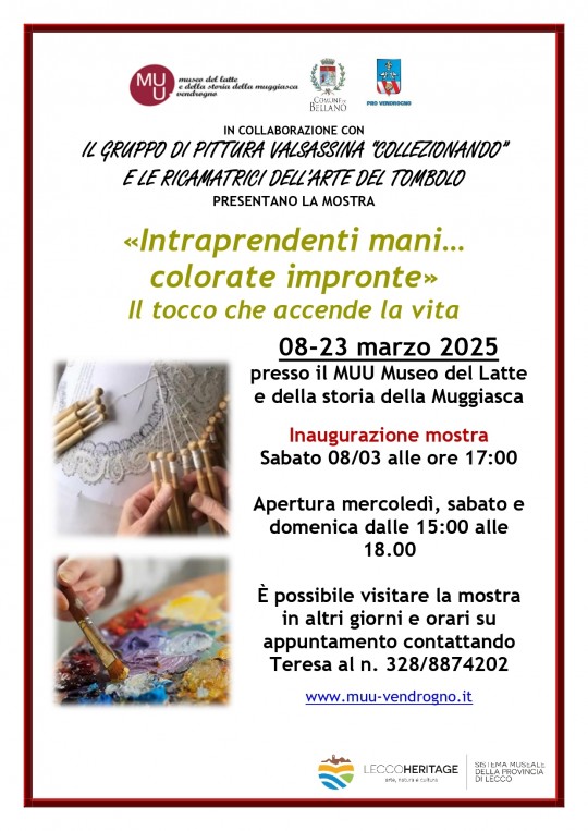 Dall’8 al 23 marzo al Museo del Latte di Vendrogno sarà possibile visitare la Mostra “Intraprendenti mani… Colorate impronte“. L’inaugurazione si terrà Sabato 8 marzo alle ore 17.00 e sarà aperta Mercoledì, Sabato e Domenica dalle ore 15.00 alle 18.00.
