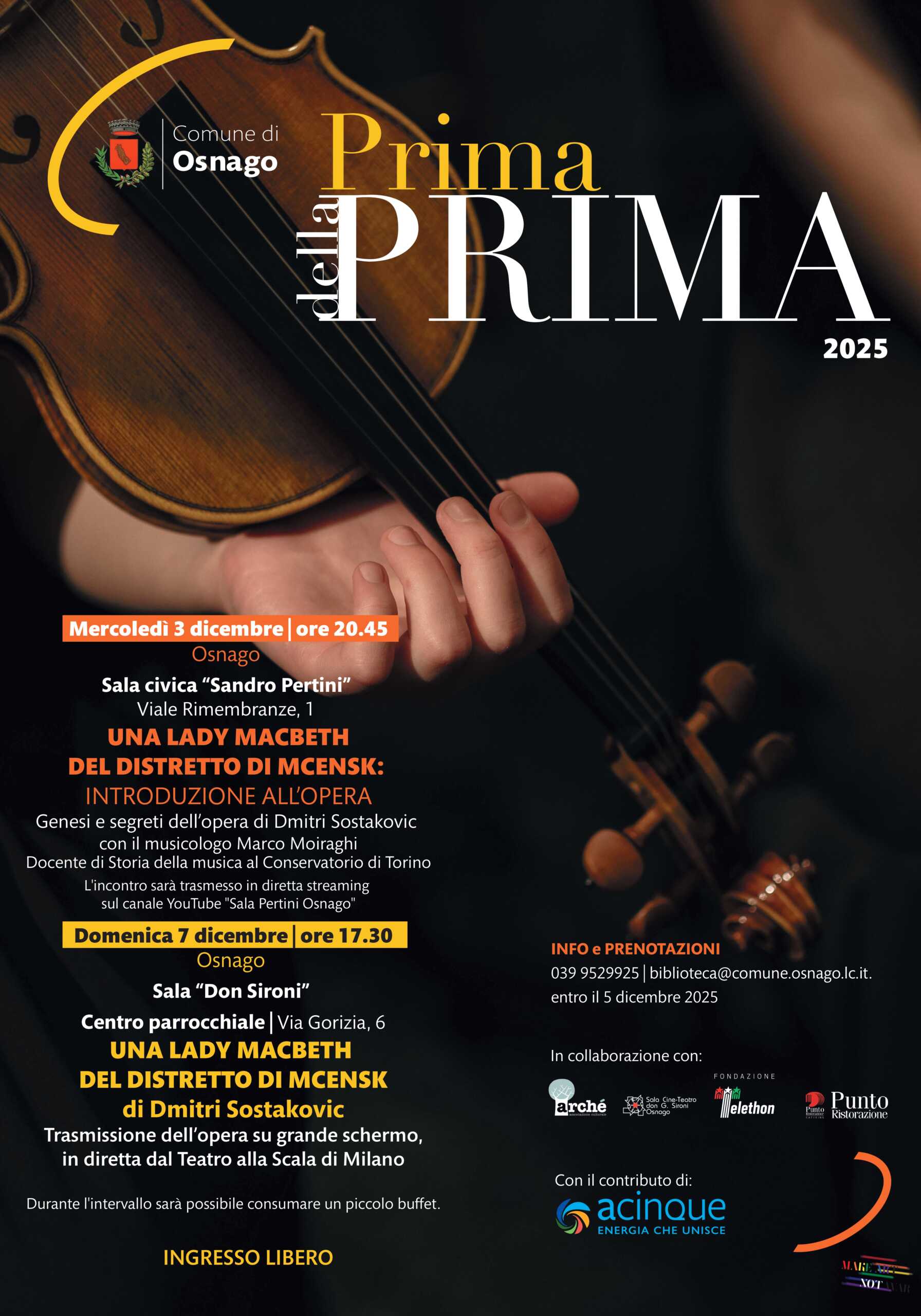 Il Comune di Osnago presenta Prima della Prima, una piccola rassegna concertistica volta a presentare l’opera Una Lady Macbeth nel distretto di Mcensk. Mercoledì 3 Dicembre, alle 20.45, si terrà presso il Centro Civico Sandro Pertini un’introduzione all’opera.