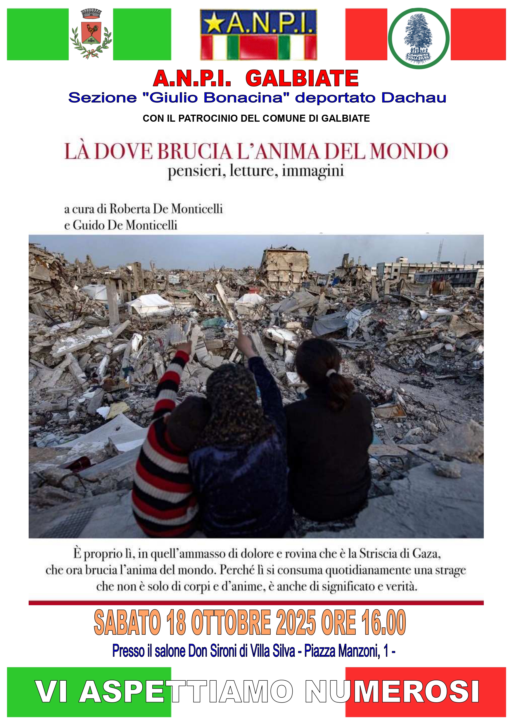 La sezione “Giulio Bonacina” deportato a Dachau dell’A.N.P.I. di Galbiate organizza per Sabato 18 Ottobre alle 16.00 l’incontro Là dove brucia l’anima del mondo – Pensieri, letture, immagini. L’evento, che riguarda il Genocidio perpetrato a Gaza da parte dello stato di Israele, si terrà presso il Salone Don Sironi di Villa Silvia, in Piazza Manzoni 1.