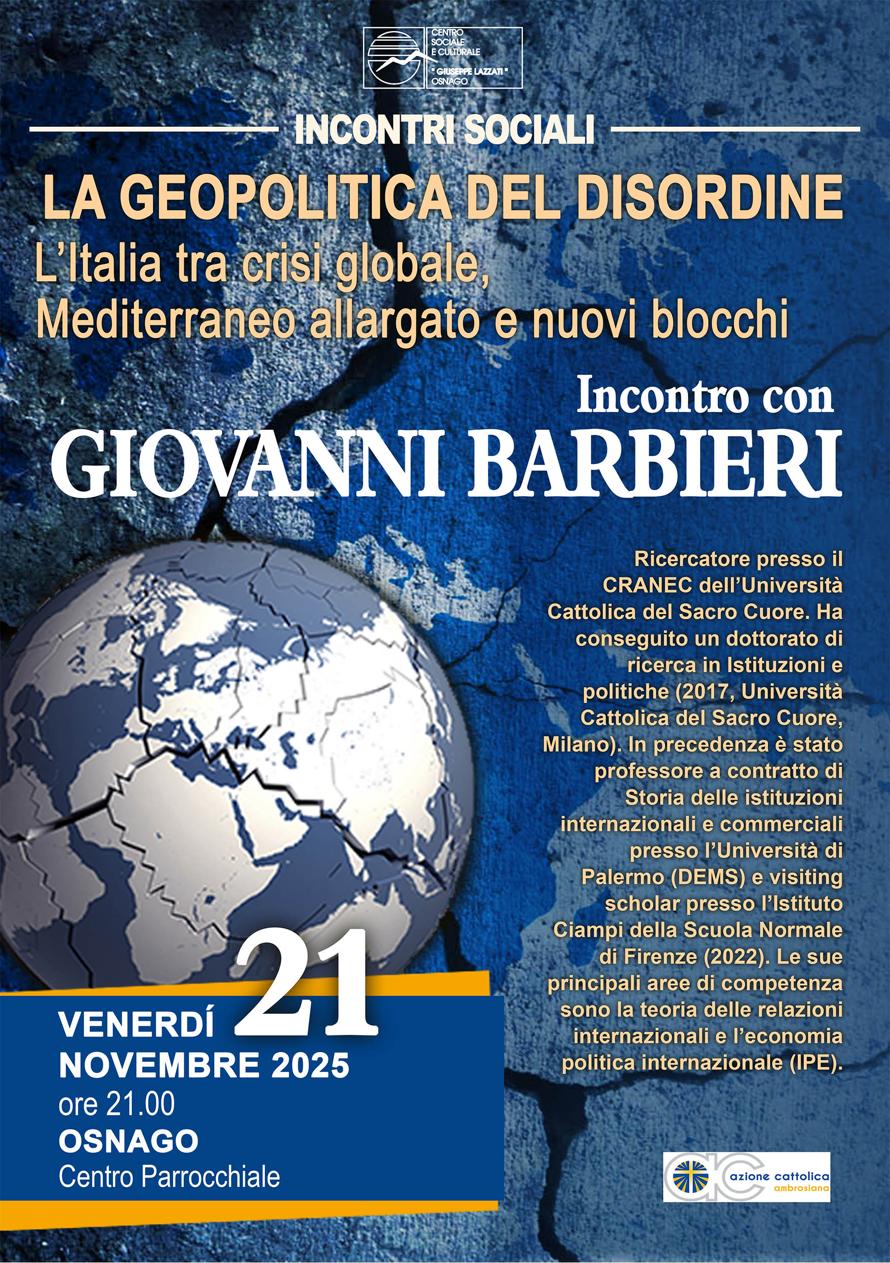 Il Prof. Giovanni Barbieri, ricercatore presso il CRANEC dell’Università Cattolica del Sacro Cuore, Venerdì 21 Novembre alle 21.00, presso il Centro Parrocchiale di Osnago, offrirà una lezione sulla geopolitica contemporanea dal titolo La geopolitica del disordine – L’Italia tra crisi globale, Mediterraneo allargato e nuovi blocchi.