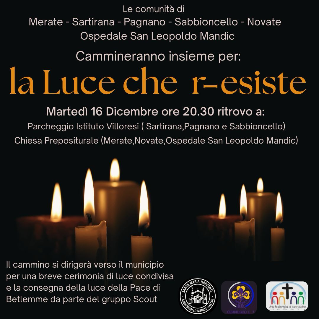 Martedì 16 Dicembre, alle 20.30, le comunità parrocchiali di Merate, Novate, Pagnano e Sartirana, insieme alla comunità francescana di Sabbioncello e alla realtà ospedaliera del San Leopoldo Mandic, invitano tutta la cittadinanza a un momento di “luce condivisa”. L’evento si chiama La luce che r-esiste e inizierà presso il parcheggio dell’Istituto Villoresi (Sartirana, Pagnano, Sabbioncello) e dalla Chiesa Prepositurale (Merate, Novate, Ospedale San Leopoldo Mandic) e si concluderà a Piazza degli Eroi a Merate.