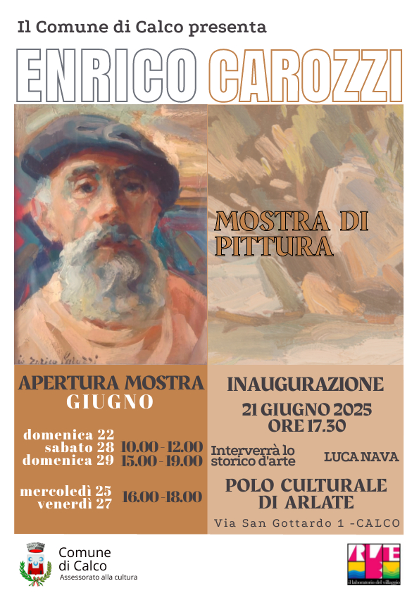 Sabato 21 Giugno alle 17.30 il Comune di Calco presenterà alla cittadinanza una mostra dedicata ad Enrico Carozzi, noto pittore milanese vissuto tra il 1910 e il 1985. La mostra sarà esposta presso il Polo Culturale di Arlate e sarà inaugurata dallo storico dell’arte Luca Nava. L’esposizione sarà visibile fino al 29 Giugno nei seguenti orari: Mercoledì e Venerdì dalle 16.00 alle 18.00 e Sabato e Domenica dalle 10.00 alle 12.00 e dalle 15.00 alle 19.00.
