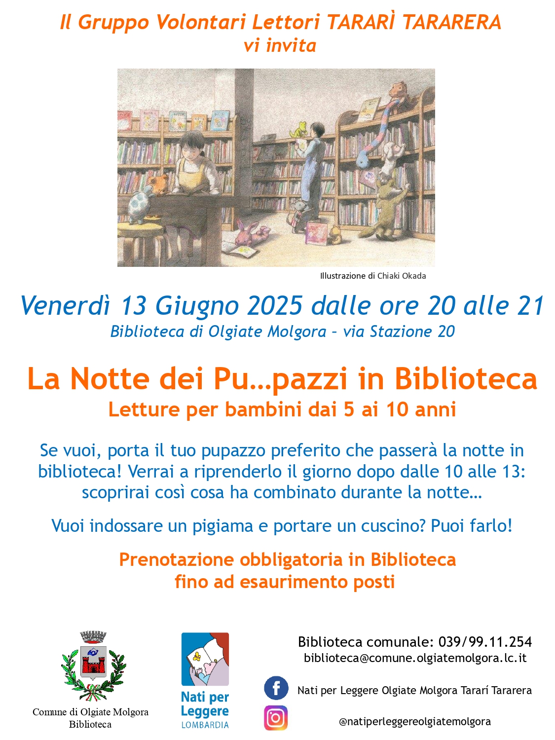 Il Gruppo Volontari Lettori Tararì Tararera organizza per Venerdì 13 Giugno, dalle 20.00 alle 21.00 una serata dal titolo “La notte dei Pu…pazzi in Biblioteca“: una serata di letture per bambini dai 5 ai 10 anni in cui i partecipanti sono invitati a portare i loro pupazzi in biblioteca. I bambini potranno riprendere i loro amici il giorno successivo dalle 10.00 alle 13.00 così da “scoprire cosa hanno combinato durante la notte”. Per chi vuole è anche possibile presentarsi vestito in pigiama e portando un cuscino.