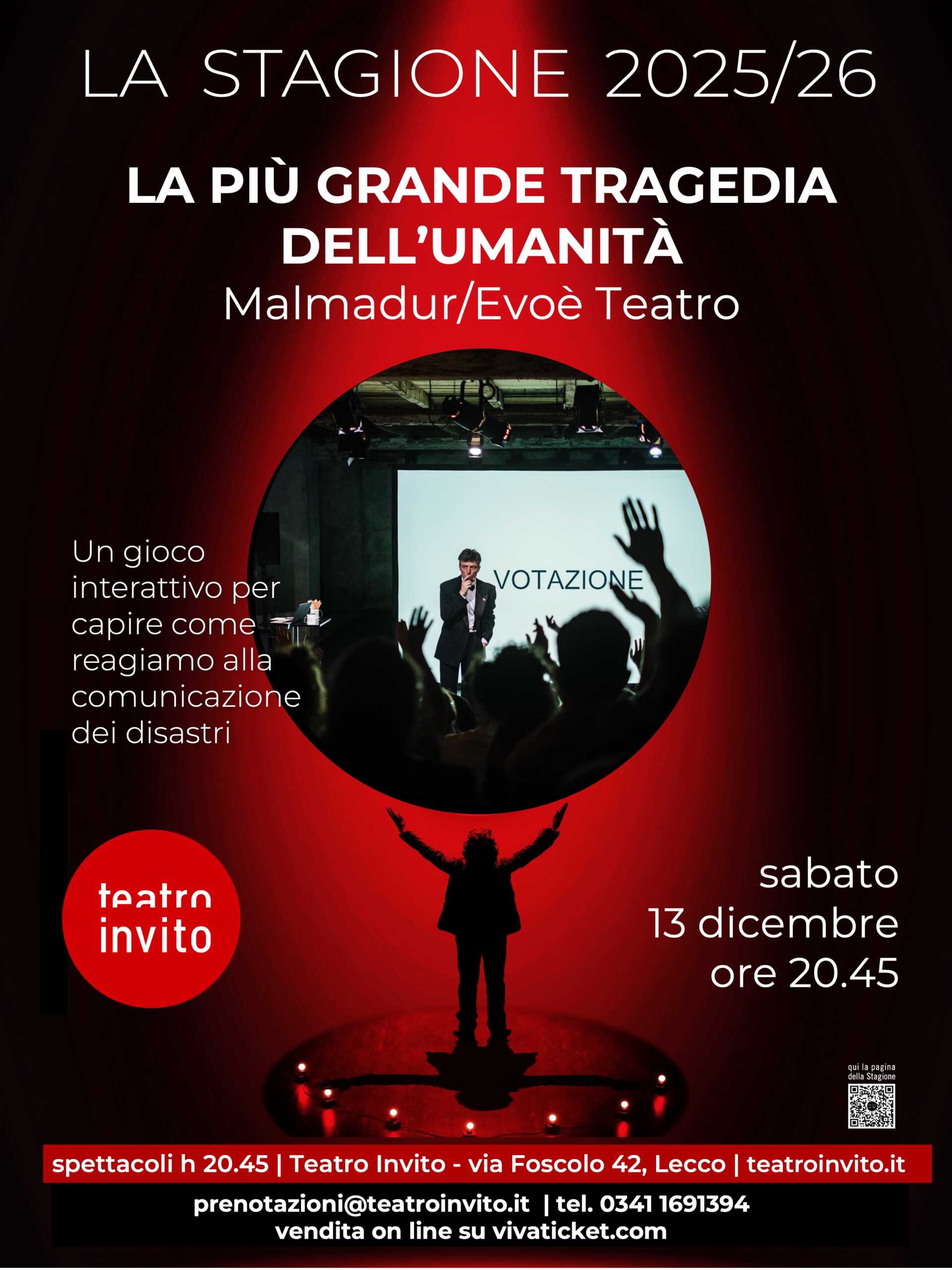 Sabato 13 Dicembre alle 20.45 Teatro Invito, a Lecco, ospita La più grande tragedia dell’umanità del regista Jacopo Giacomoni e con Yoko Yamada e Jacopo Giacomoni. Lo spettacolo consiste in gioco interattivo per capire come reagiamo alla comunicazione dei disastri.