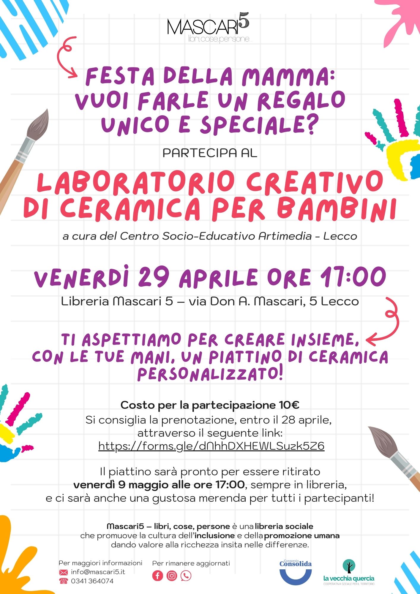 In occasione della Festa della Mamma, la Libreria Mascari5 organizza un laboratorio creativo di ceramica per bambini, in programma venerdì 29 aprile alle 17:00 presso la sede della libreria, in via Don Antonio Mascari 5, Lecco.