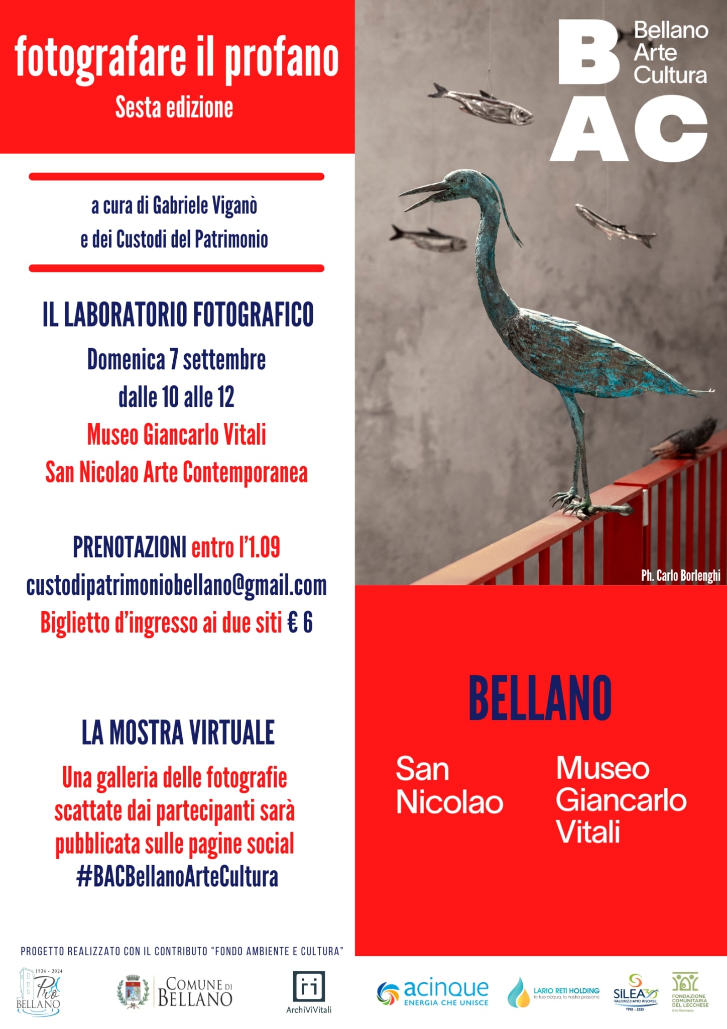 Il laboratorio deve essere prenotato entro Lunedì 1 settembre scrivendo a custodipatrimoniobellano@gmail.com. Il costo di partecipazione è di 6 euro. Una galleria delle fotografie scattate dai partecipanti sarà pubblicata sulle pagine social #BACBellanoArteCultura