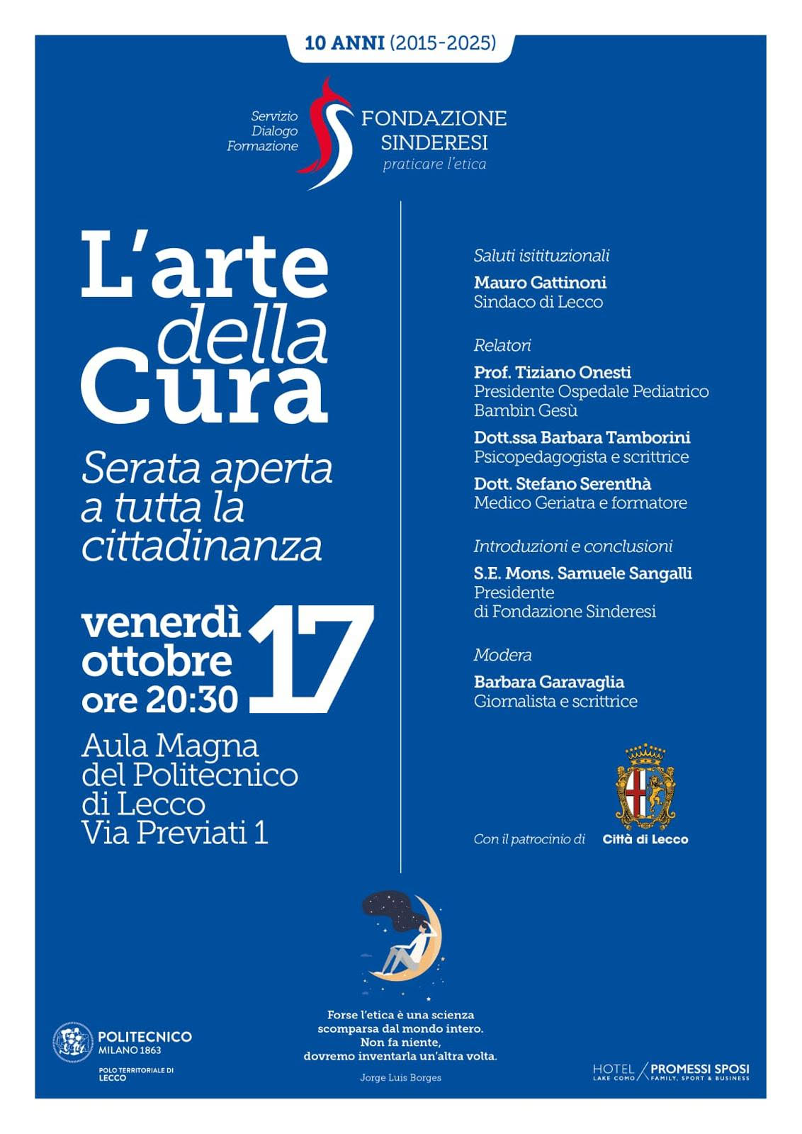 Venerdì 17 Ottobre alle 20.30, a Lecco, presso l’aula magna del Politecnico, si terrà una serata dal titolo: L’arte della cura, aperta a tutta la cittadinanza e senza prenotazioni.