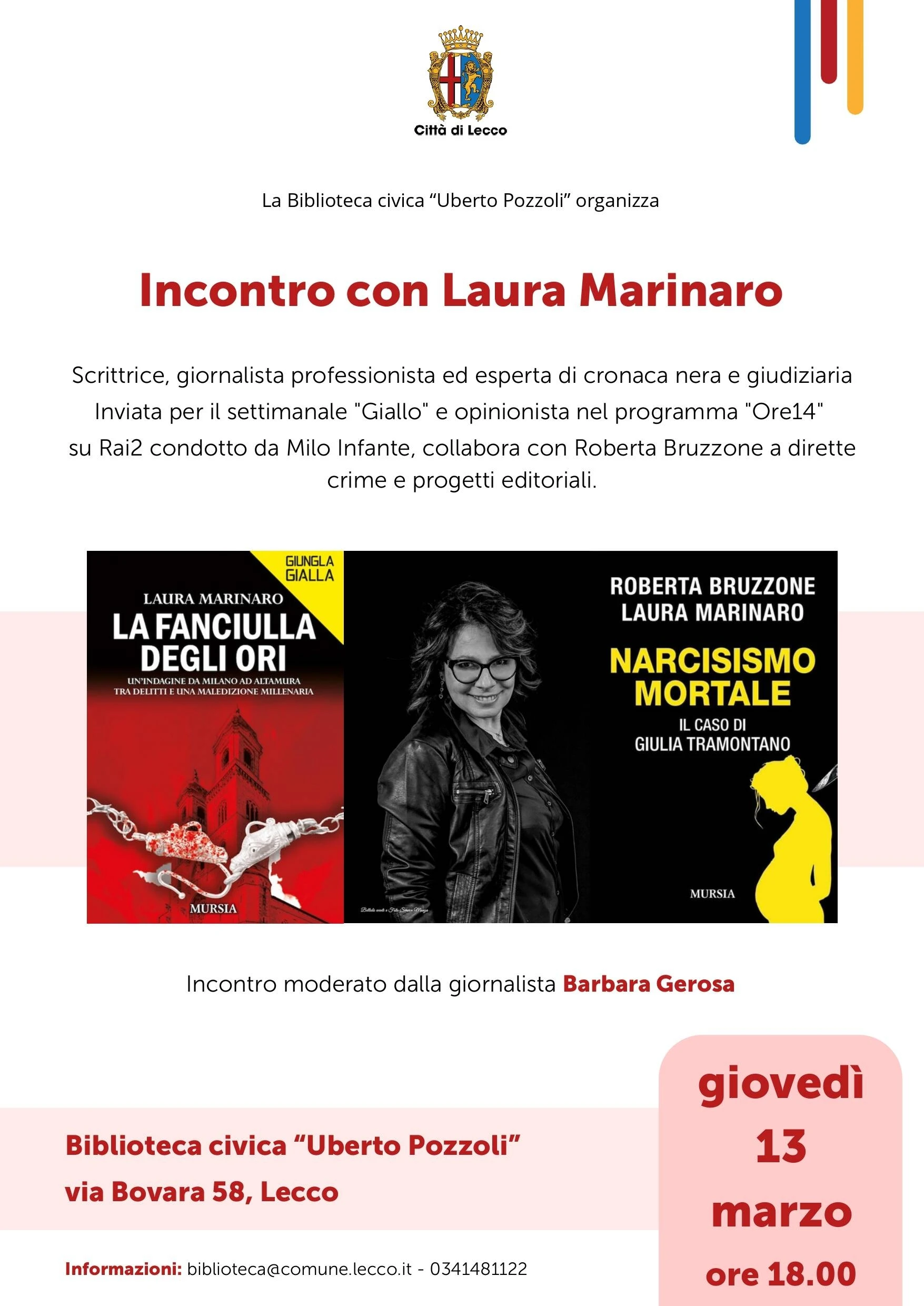 Giovedì 13 marzo alle ore 18.00, presso la biblioteca civica U. Pozzoli di Lecco, la giornalista e scrittrice Laura Marinaro presenterà il suo ultimo romanzo “La fanciulla degli ori – Un’indagine da Milano ad Altamura tra delitti e una maledizione millenaria”, un’opera che intreccia il fascino della storia con il mistero dell’investigazione. L’ingresso è libero, per maggiori informazioni si rimanda a a biblioteca@comune.lecco.it