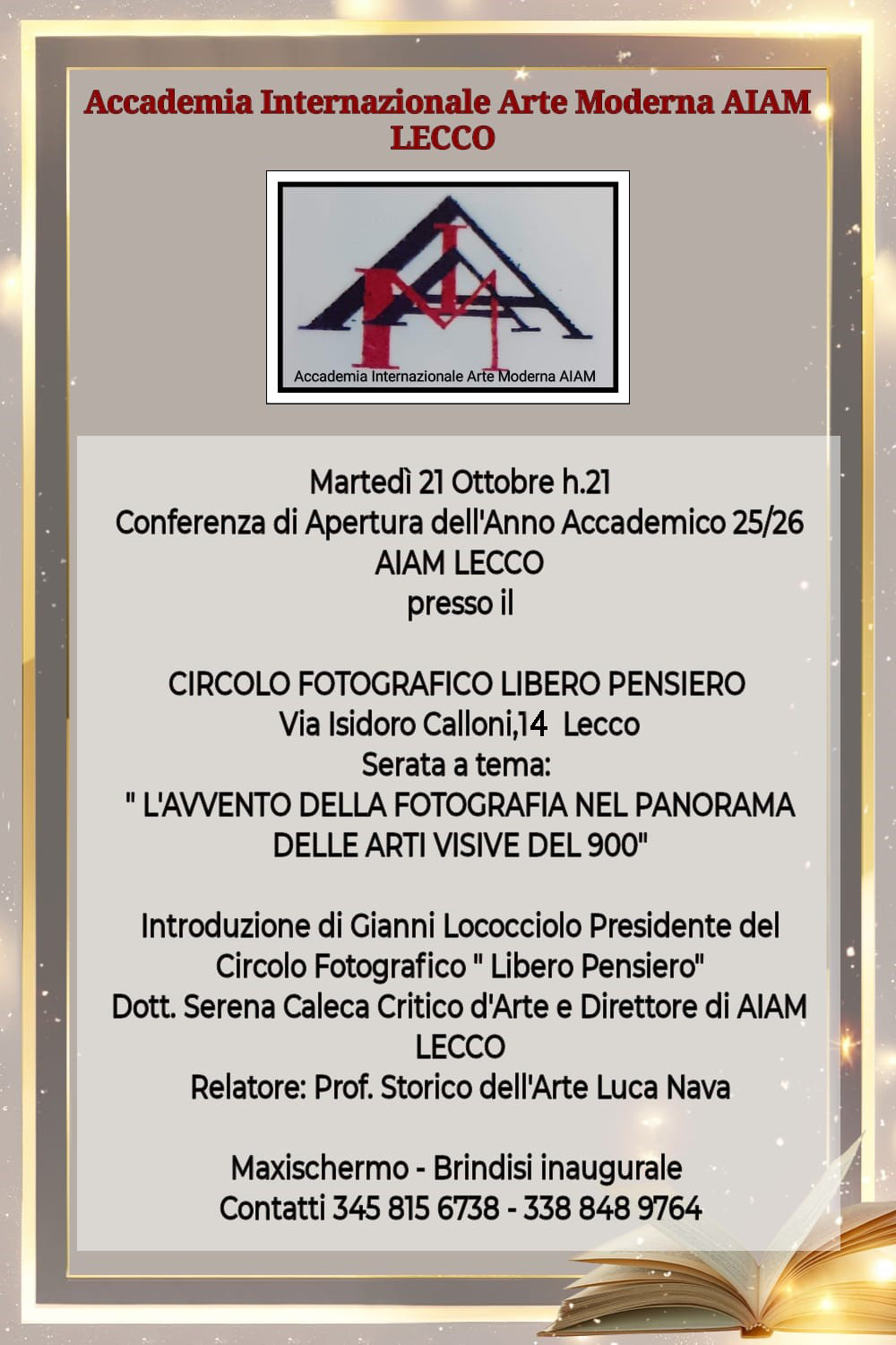 Il Foto Club Libero Pensiero in collaborazione con AIAM (Accademia Internazionale Arte Moderna) organizza per Martedì 21 Ottobre alle 21.00 la serata L’avvento della fotografia nel panorama delle arti visive del ‘900 a cura dello Storico dell’Arte Professore Luca Nava. La serata, a ingresso libero, è in programma presso la sala da ballo del circolo Libero Pensiero.