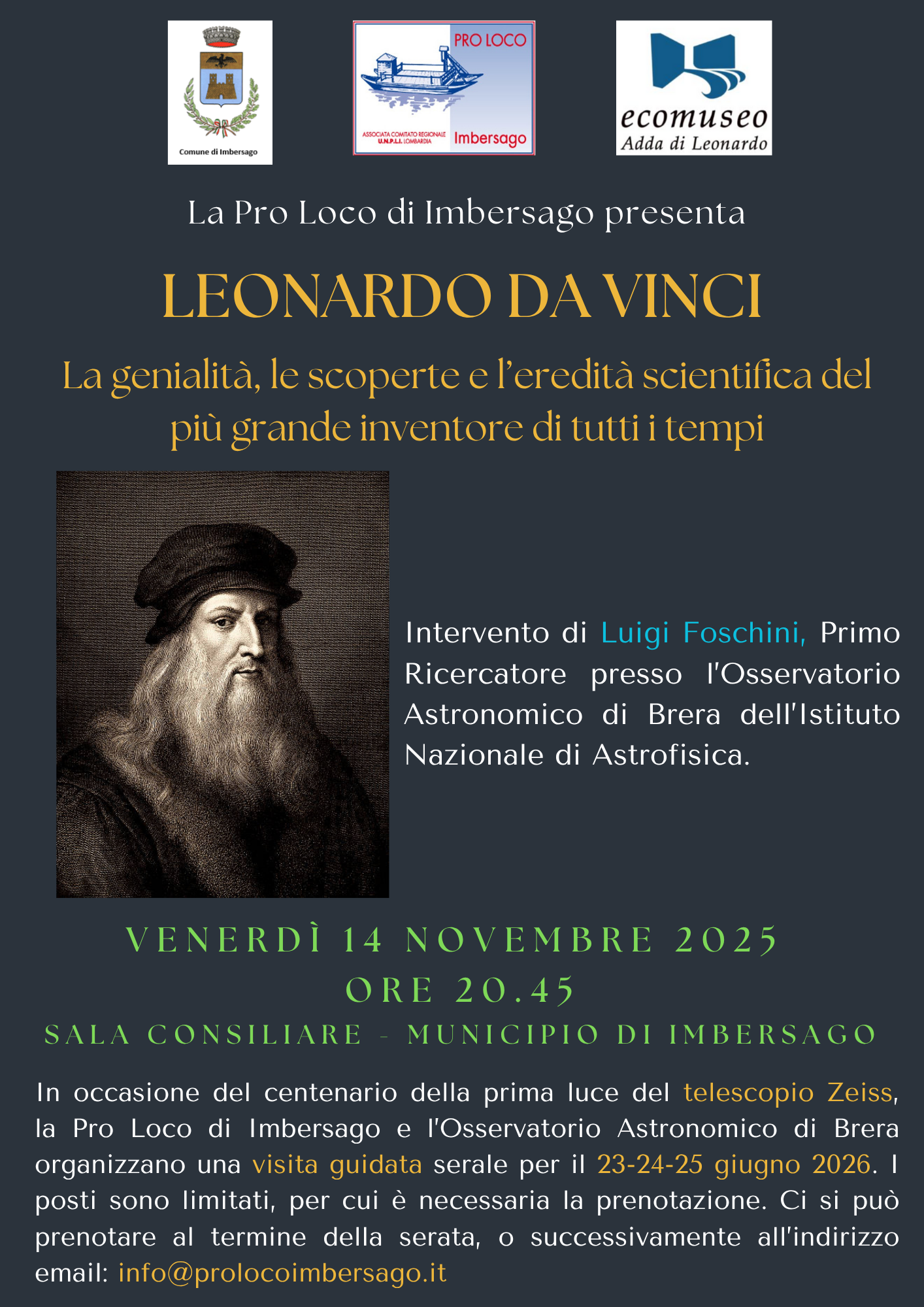 La Pro Loco di Imbersago organizza per Venerdì 14 Novembre alle 20.45 una serata dal titolo Leonardo da Vinci – La genialità, le scoperte e l’eredità scientifica del più grande inventore di tutti i tempi. L’evento si terrà presso la Sala Consiliare del Municipio e vedrà intervenire Luigi Foschini, primo ricercatore presso l’Osservatorio Astronomico di Brera dell’istituto nazionale di astrofisica.