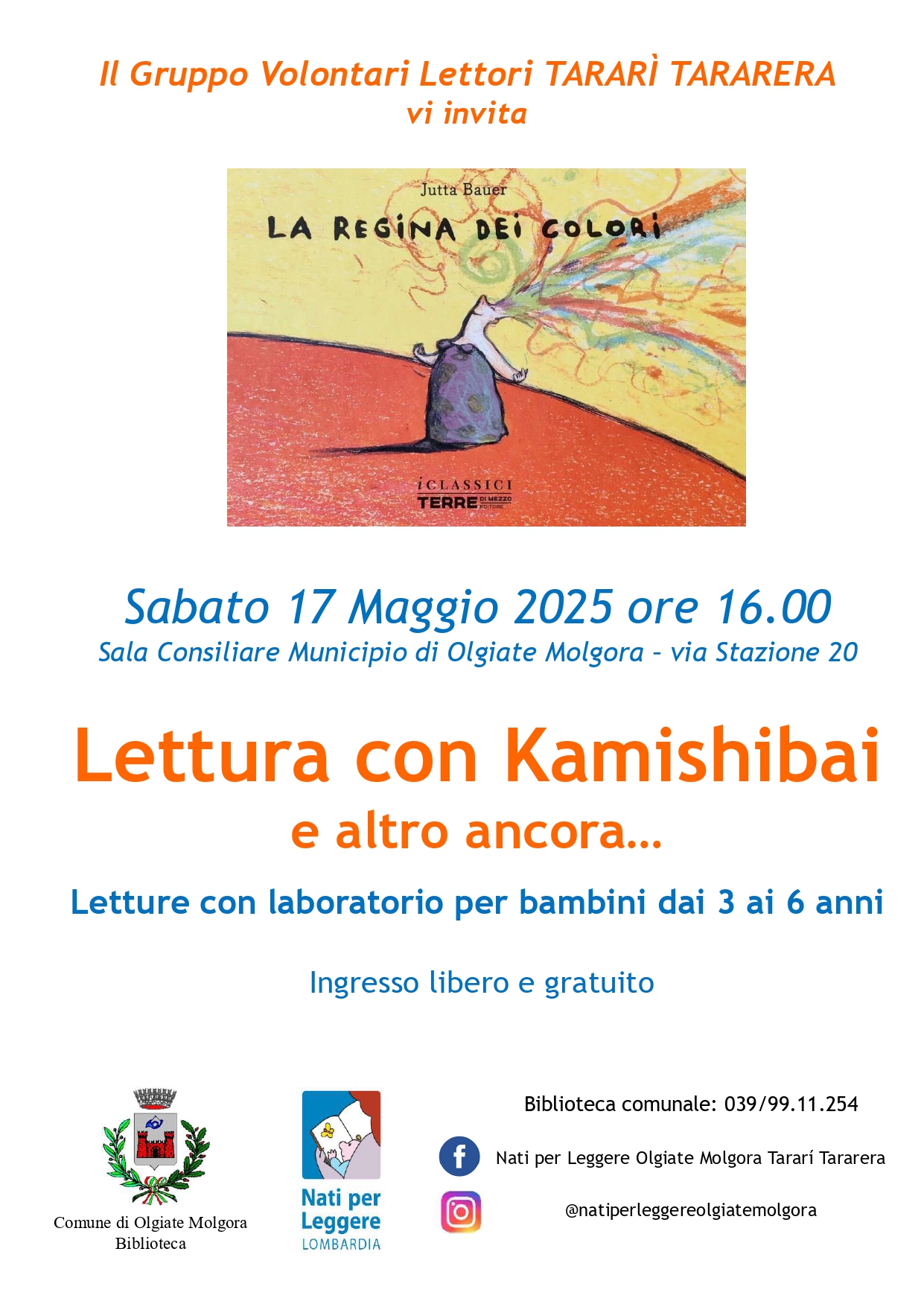 “Lettura con Kamishiabi e altro ancora…” è l’iniziativa della rassegna “Nati per Leggere” in programma per Sabato 17 Maggio alle 16.00 presso la Sala Consiliare di Olgiate Molgora. L’evento, che sarà tenuto dal Gruppo Volontari Lettori TARARÌ TARARERA, consisterà in diverse letture con laboratorio per bambini dai 3 ai 6 anni. L’ingresso è libero e gratuito, per maggiori informazioni si rimanda al numero di telefono della Biblioteca comunale: 039/99.11.254