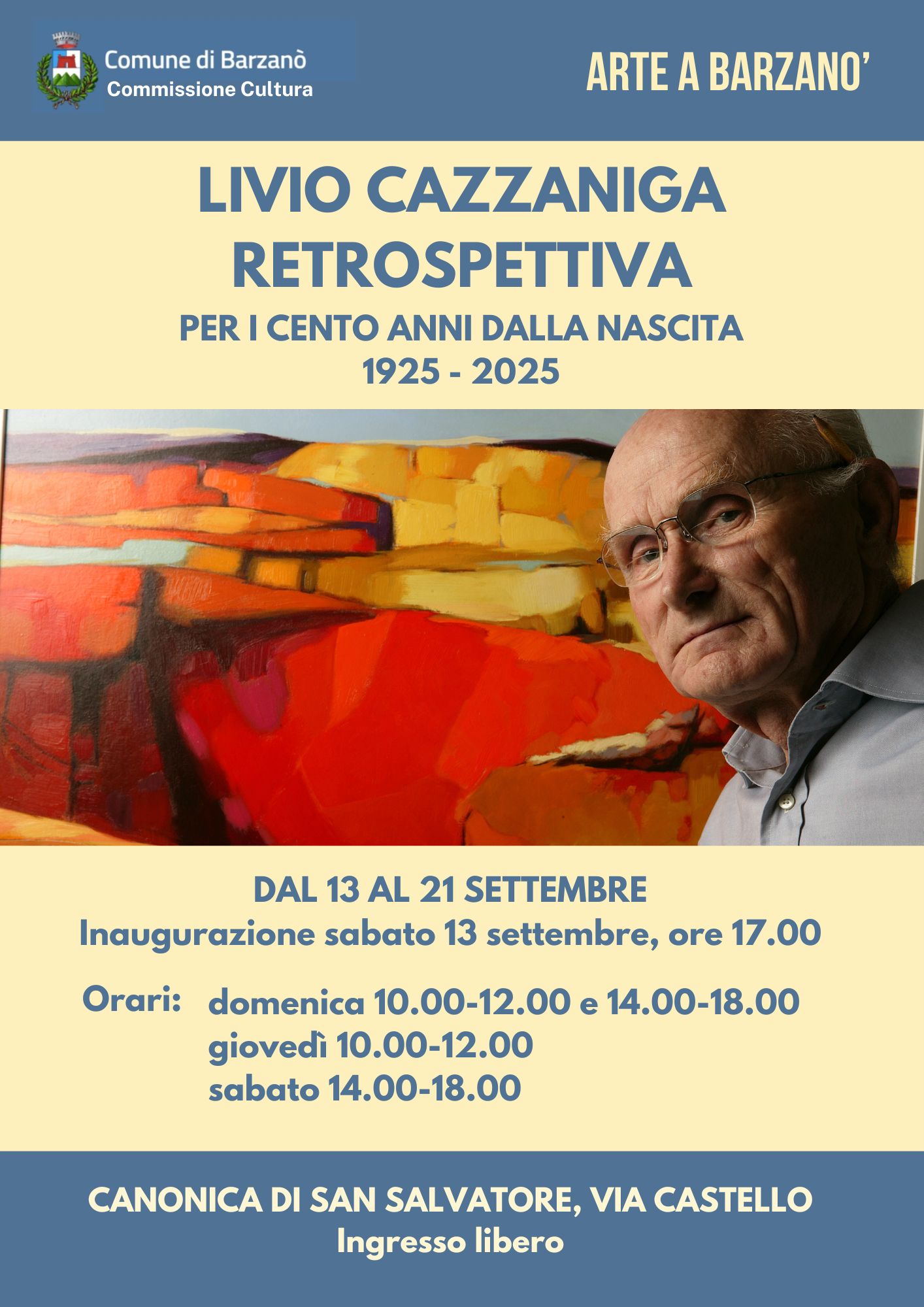 Livio Cazzaniga è nato a Barzanò, dove ha sempre vissuto, il 22 luglio 1925. Scomparso il 23 maggio 2023, quest’anno avrebbe festeggiato cento anni. Il Comune di Barzanò, con la Commissione Cultura, e la famiglia Cazzaniga – moglie, figli e nipoti – celebrano questa importante ricorrenza con una retrospettiva che si svolgerà all’interno della Canonica di San Salvatore di Barzanò, da sabato 13 a domenica 21 settembre con i seguenti orari: domenica 10.00-12.00 e 14.00- 18.00, giovedì 10.00-12.00, sabato 14.00-18.00. Ingresso libero.