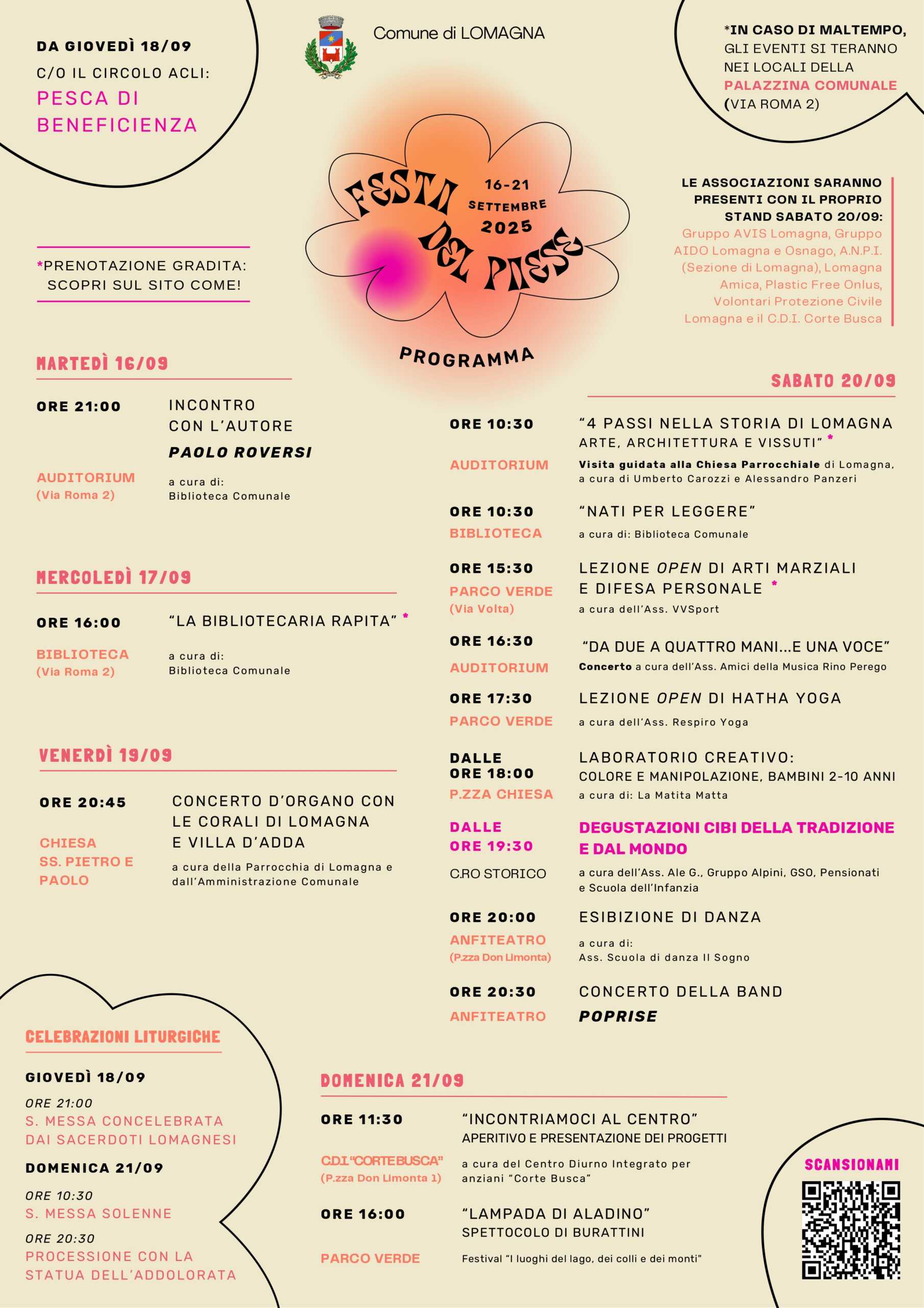 Anche quest’anno Lomagna si prepara alla tradizionale Festa del Paese, un’occasione speciale per vivere insieme momenti di cultura, musica, sport e divertimento per tutte le età. Da Martedì 16 a Lunedì 22 settembre, il centro storico si animerà con un ricco programma di eventi organizzati dall’Amministrazione Comunale in collaborazione con le associazioni locali e la Parrocchia di Lomagna.
