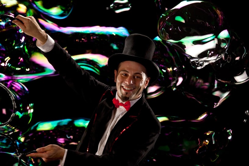 Uno spettacolo comico e magico, un viaggio onirico e visuale accompagnato dalla magia delle piccole cose e da spettacolari effetti con acqua e sapone che affascineranno piccoli e grandi.