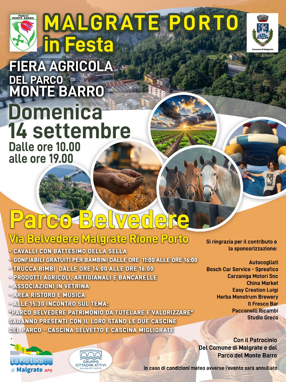 Domenica 14 Settembre si terrà l’evento Malgrate Porto In Festa e Fiera Agricola del Parco del Monte Barro al Parco Belvedere in via Belvedere a Malgrate Rione Porto. L’evento durerà dalle 10.00 alle 19.00 e offrirà diversi svaghi quali gonfiabili gratuiti (11.00-16.00), cavalli per il battesimo della saddle trial, truccabimbi (14.00-16.00), area ristoto, musica con dj (dalle 15.30) e stando con prodotti agricoli artigianali.