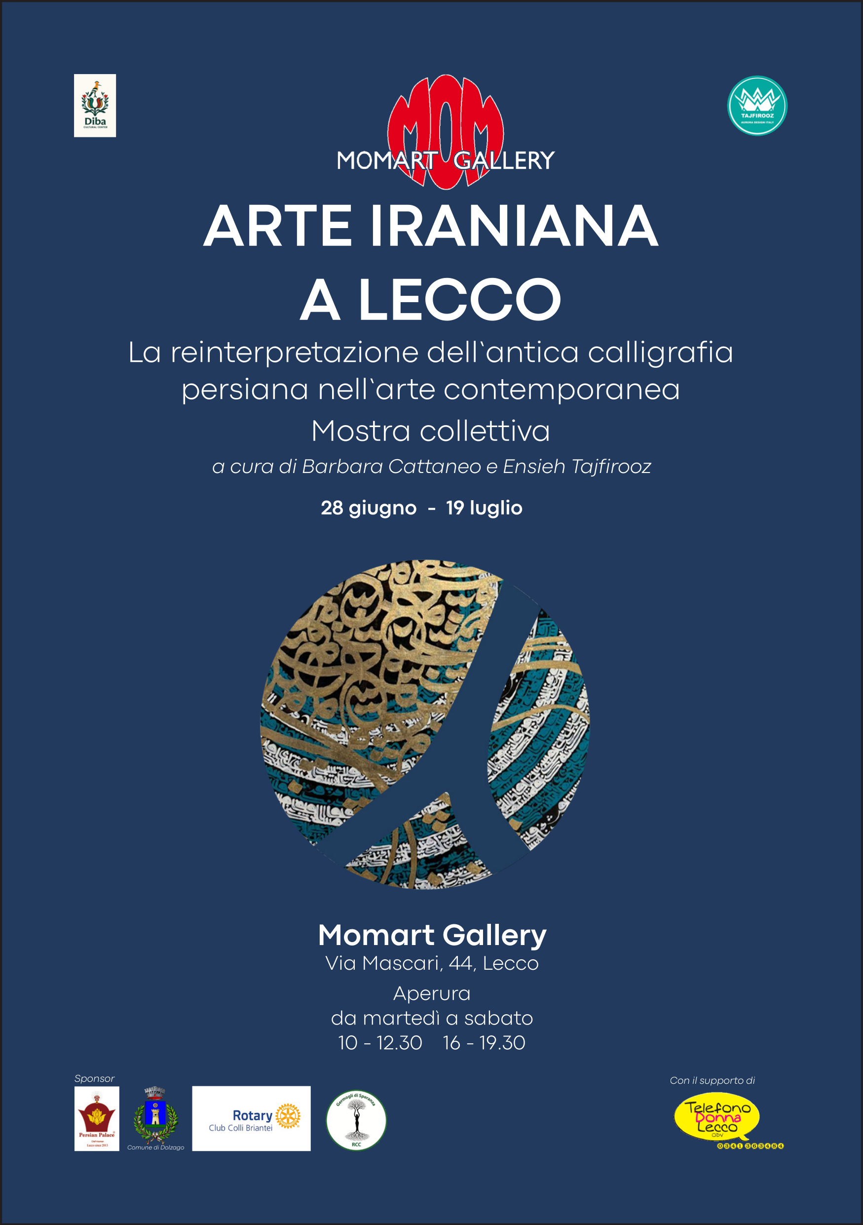 La mostra “Arte iraniana a Lecco”, in programma dal 28 giugno al 19 luglio 2025 negli spazi della Momart Gallery di via Mascari 44, si propone come un ponte tra mondi, memorie e linguaggi, in un dialogo tanto potente quanto necessario. La mostra è a ingresso libero ed è possibile visitarla da Martedì a Sabato dalle 10.00 alle 12.30 e dalle 16.00 alle 19:30.
