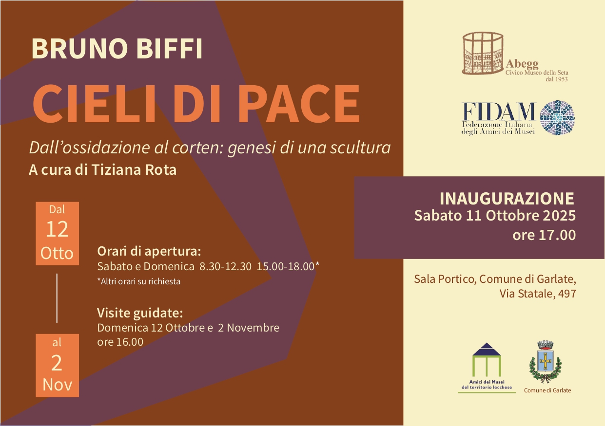 Verrà inaugurata Sabato 11 Ottobre alle 17.00 la mostra Cieli di Pace di Bruno Biffi a Garlate nella Sala Portico, Comune di Garlate. La scultura in questione sarà donata dall’artista nella giornata Nazionale ed Europea della FIDAM (Federazione italiana degli Amici dei Musei) per conto degli Amici dei Musei del territorio lecchese. La scultura sarà collocata all’aperto nel giardino a lago, in prossimità del Civico Museo della Seta Abegg. Un segnale forte di bellezza, memoria e speranza