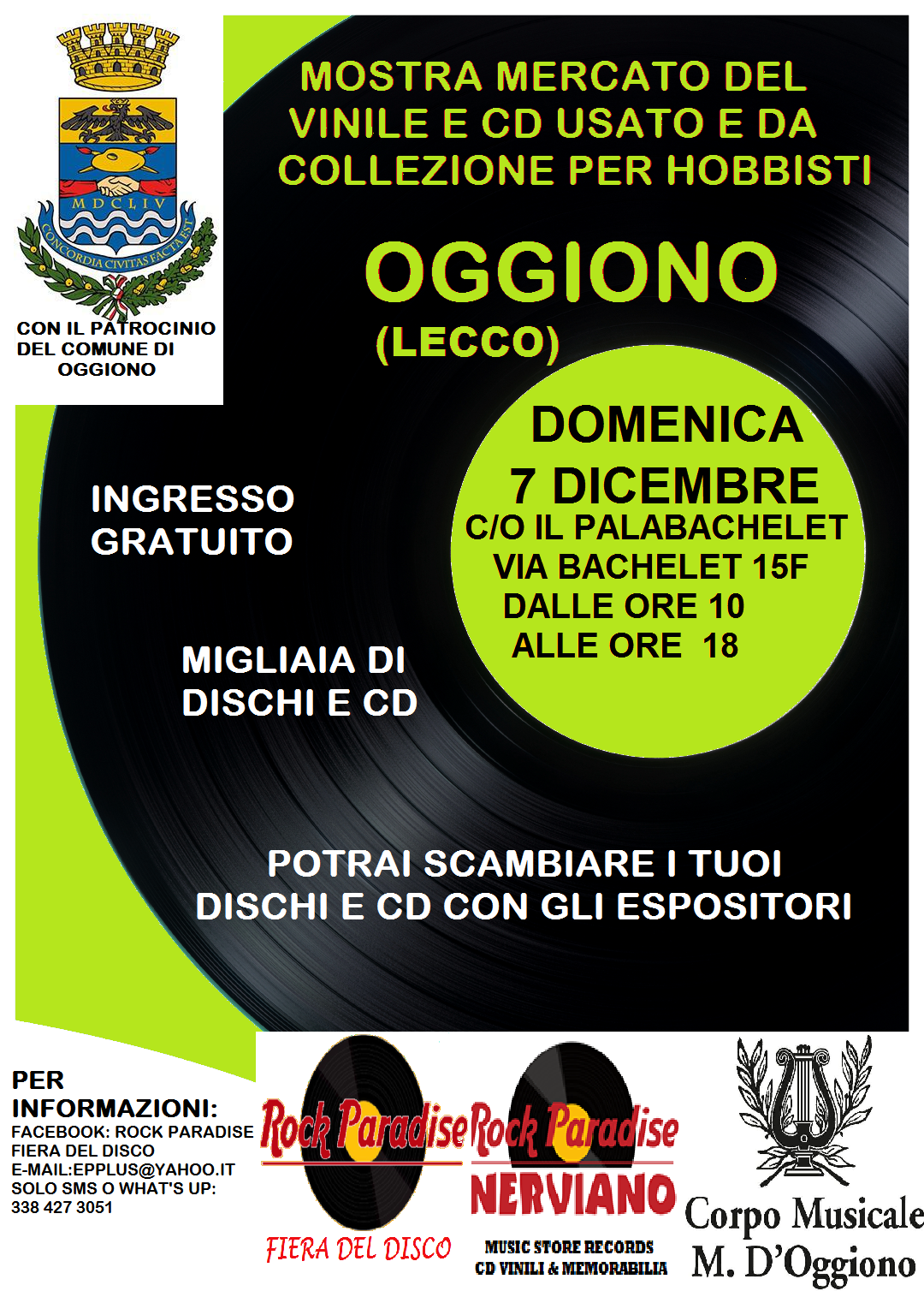 Domenica 7 Dicembre, dalle 10.00 alle 18.00, si terrà la Mostra Mercato del Vinile e cd per Hobbisti ad Oggiono, presso il Palabachelet.