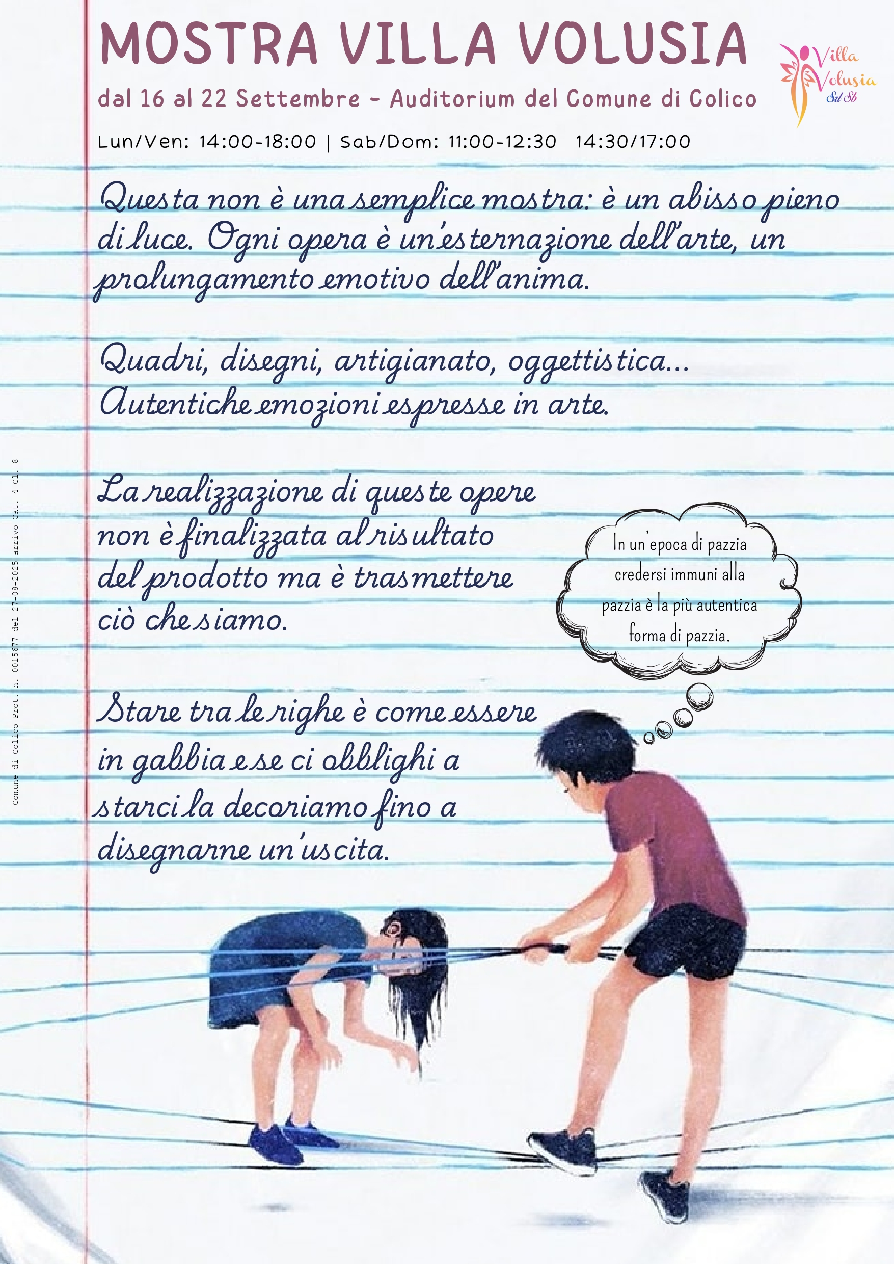Da Martedì 16 a Sabato 20 Settembre, presso l’Auditorium del Comune di Colico, sarà visibile la mostra Villa Volusia, da Lunedì a Venerdì dalle 14.00 alle 18.00 e Sabato e Domenica dalle 10.00 alle 12.30 e dalle 14.30 alle 17.00.