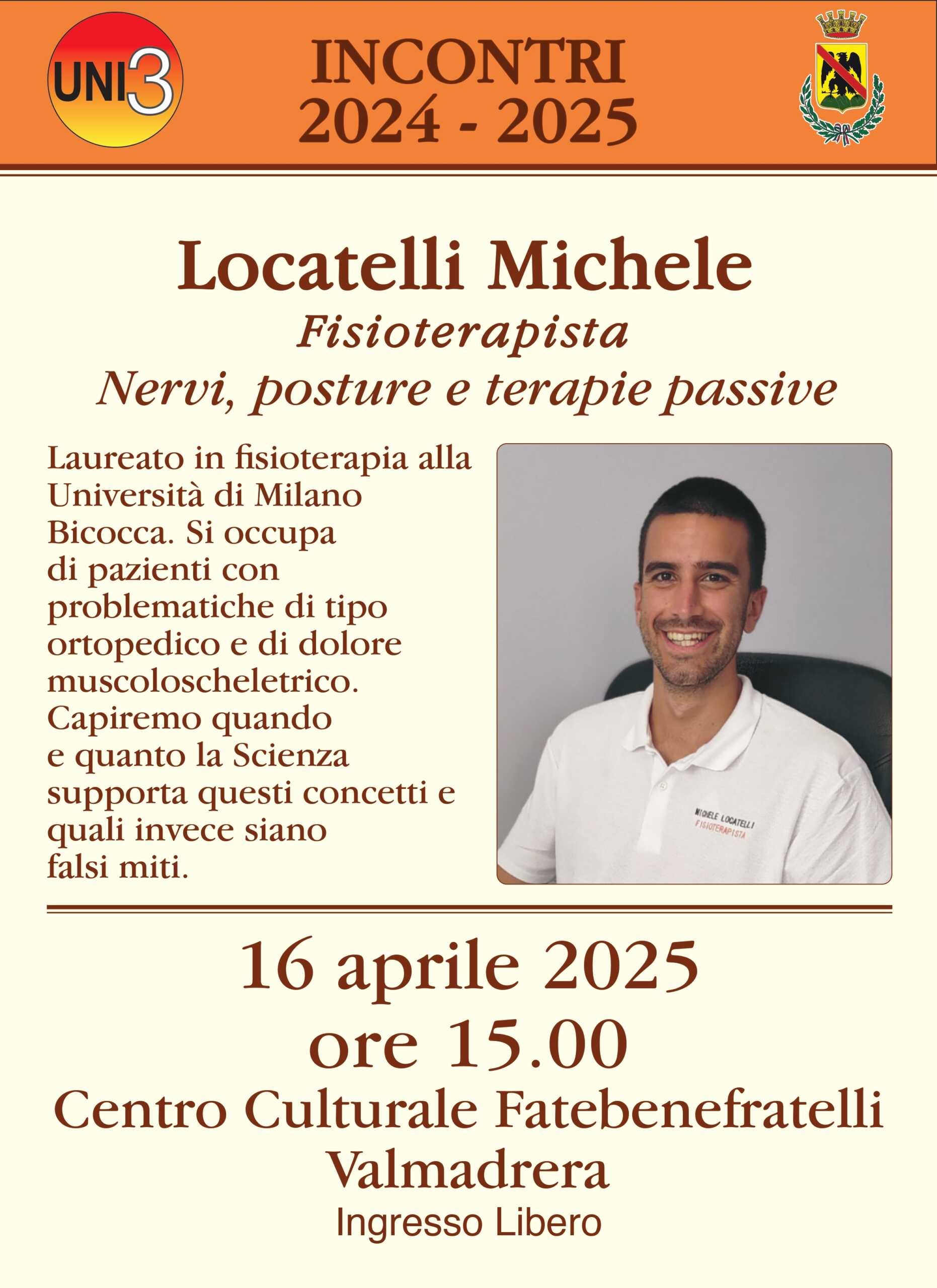 L’Amministrazione Comunale di Valmadrera propone il tredicesimo incontro dell’edizione 2024-2025 di “UNI3” Università della Terza Età, “Nervi, posture e terapie passive”, con il fisioterapista Michele Locatelli. L’incontro si terrà mercoledì 16 aprile, alle ore 15.00, presso la Sala Auditorium del Centro Culturale Fatebenefratelli di Valmadrera.