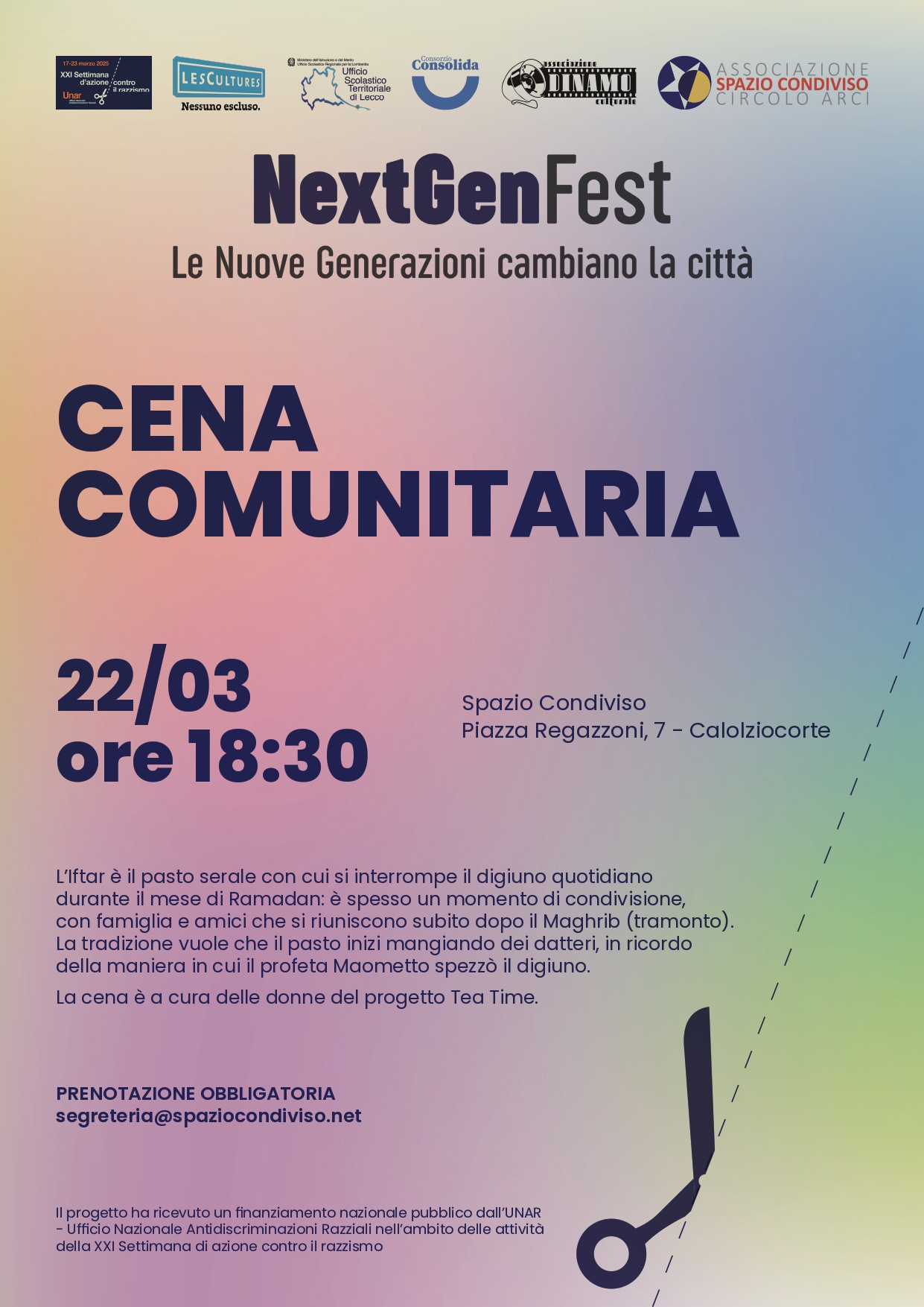Sabato 22 marzo alle 18:30 si terrà presso il Circolo Arci Spazio Condiviso di Calolziocorte la Cena comunitaria – Iftar di condivisione. La cena è un momento conviviale per scoprire e condividere la tradizione dell’Iftar, il pasto serale che interrompe il digiuno quotidiano nel mese di Ramadan, a cura delle donne del progetto Tea Time. La prenotazione è obbligatoria segreteria@spaziocondiviso.net, ingresso con offerta libera e tessera ARCI.