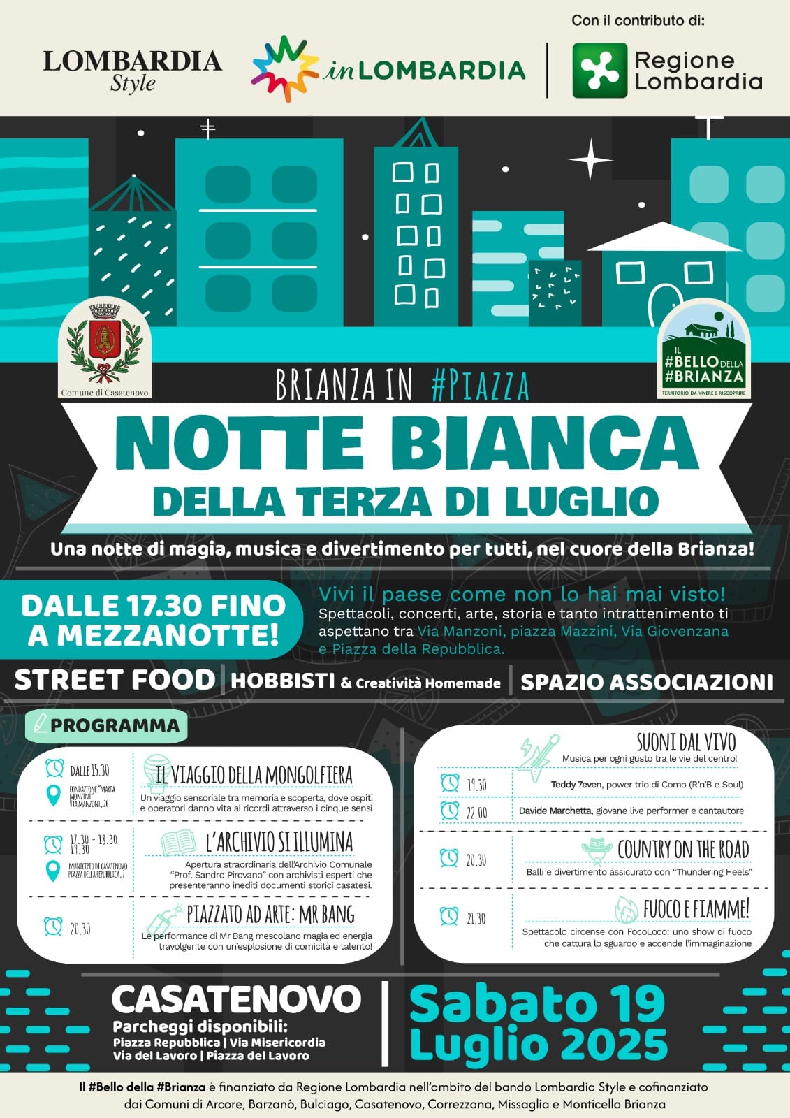 Il Comune di Casatenovo propone per il 19 Luglio la Notte Bianca: dalle 17.30 fino a mezzanotte la città si animerà di musica, cibo e aria di festa.