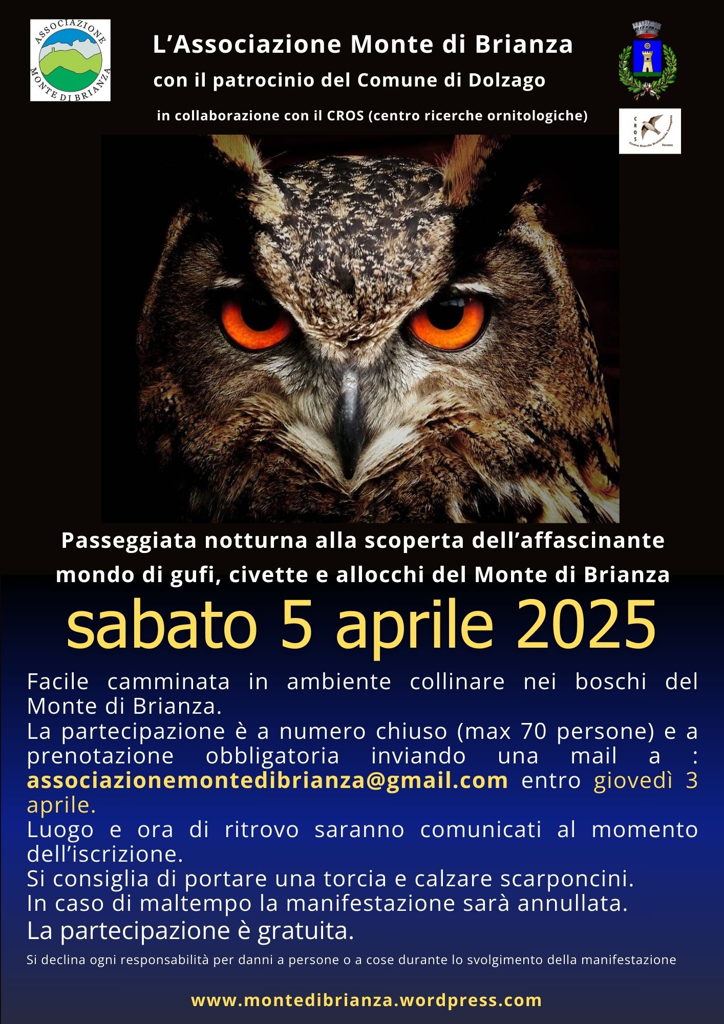 L’associazione Monte di Brianza, sabato 5 aprile, organizza in collaborazione con il CROS di Varenna e con il patrocinio del comune di Dolzago, l’uscita notturna “Notte da Gufi”.