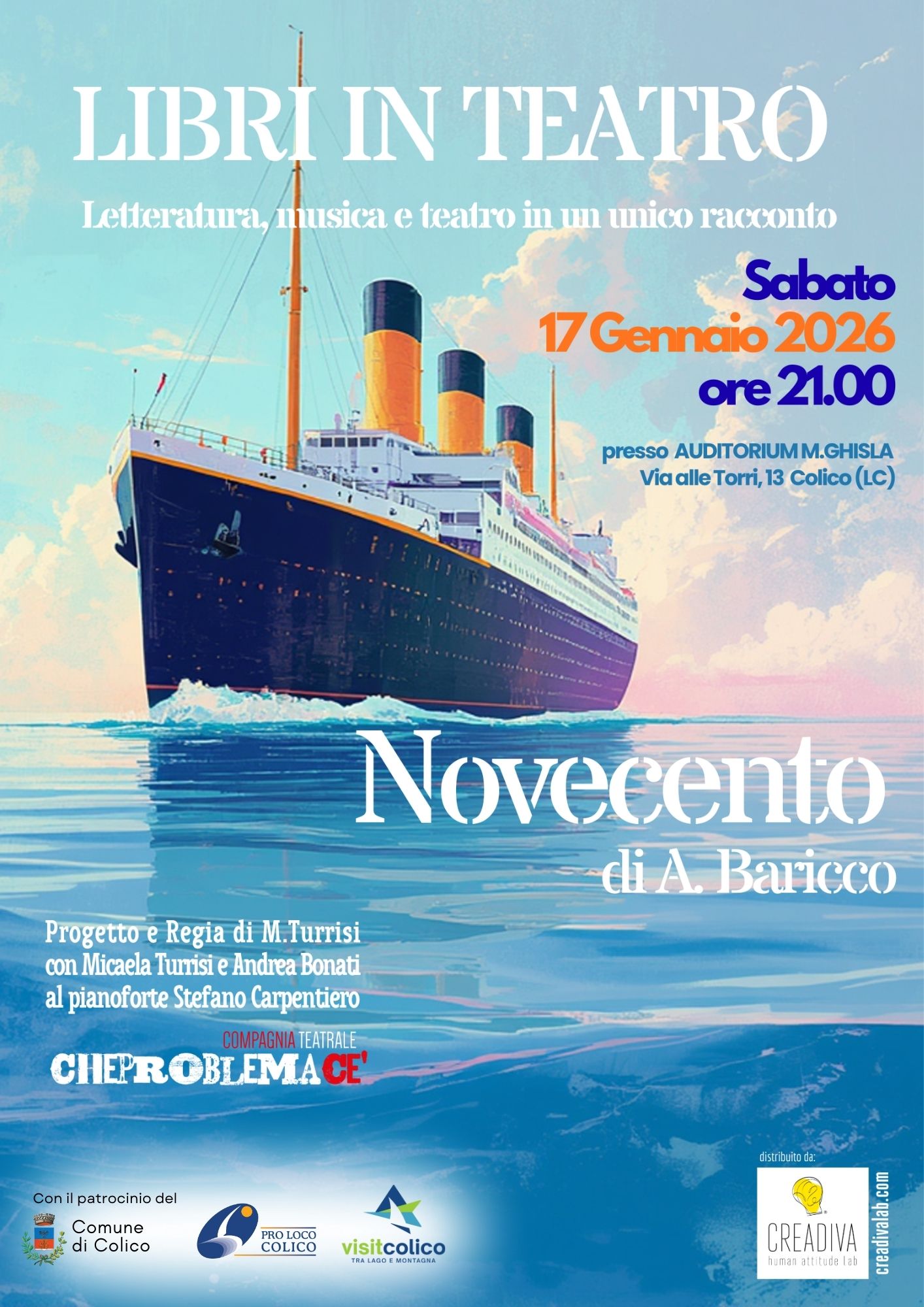 Un racconto intenso e poetico che prende vita attraverso l’interpretazione di Micaela Turrisi e Andrea Bonati, accompagnati dalla musica dal vivo al pianoforte, parte integrante della narrazione. La storia è quella di un pianista, nato e vissuto su una nave senza mai scendere a terra, capace di raccontare il mondo attraverso la sua musica. Lo spettacolo unisce parola, emozione e suono in una messa in scena essenziale e coinvolgente.