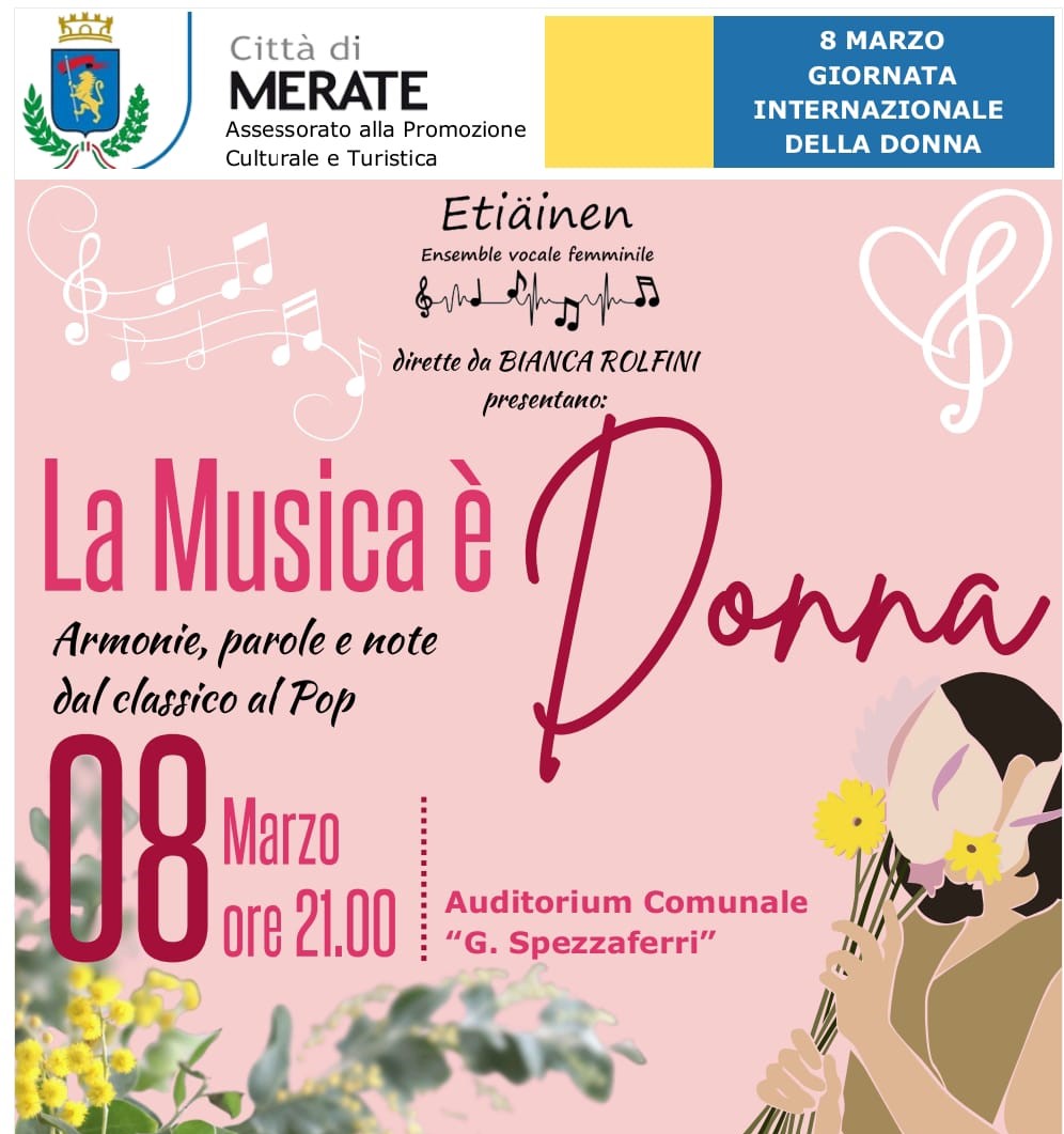 Appuntamento per l’ensemble vocale femminile Etiainen diretto da Bianca Rolfini. L’8 marzo alle 21.00 presso l’Auditorium comunale “G. Spezzaferri”, in piazza degli Eroi 3 a Merate, presenterà “La Musica è Donna”: armonie, parole e note dal classico al pop, in occasione della Giornata internazionale della donna.