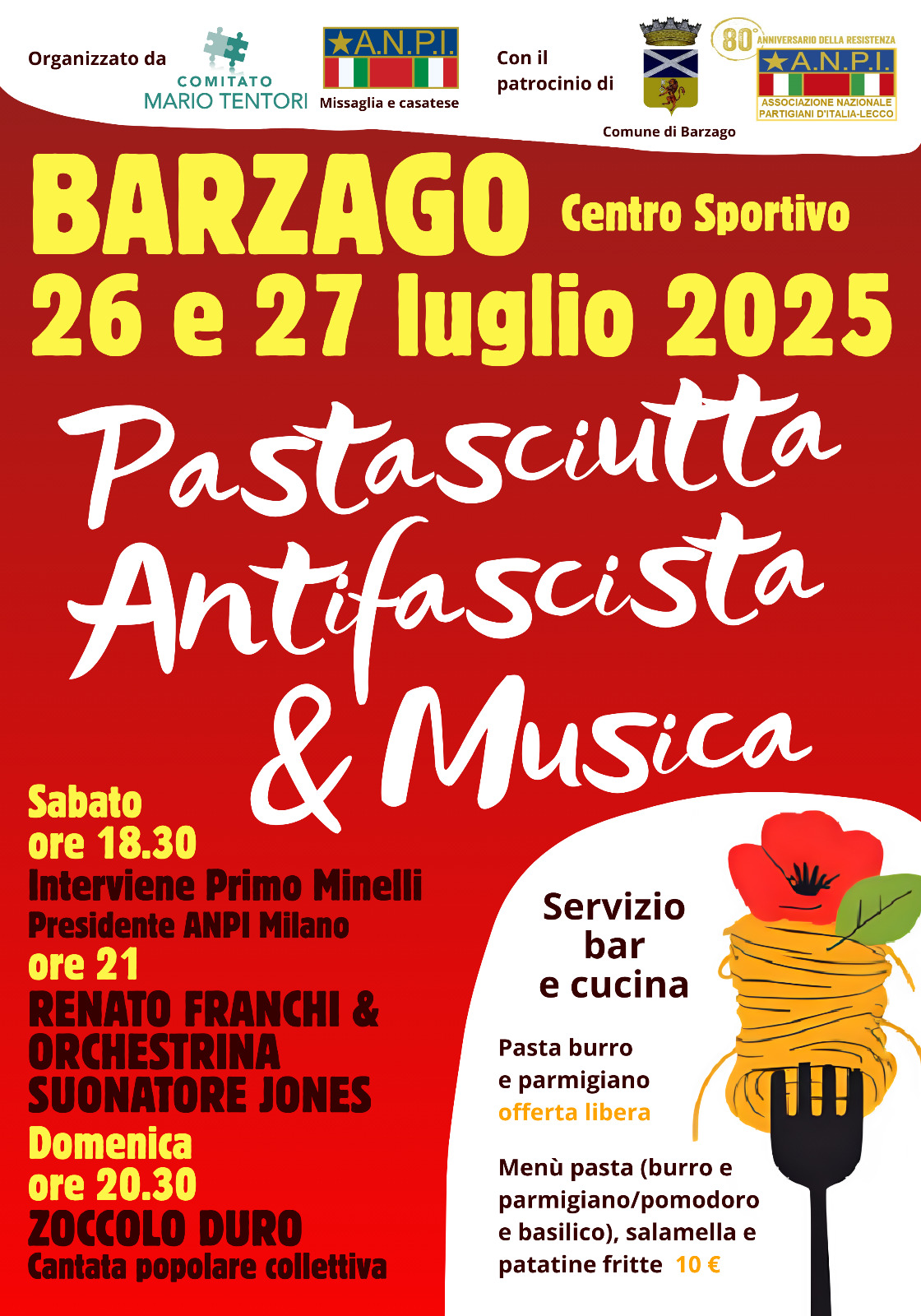Nelle giornate di Sabato 26 e Domenica 27 Luglio il Comitato Mario Tentori organizza insieme all’ANPI, sezione Missaglia e Casatese, la pastasciutta antifascista, basata sulla tradizione della famiglia Cervi che offrì pasta a tutti gli abitanti del paese il 25 luglio 1943 per celebrare la fine del fascismo. L’evento si svolgerà presso la struttura feste del centro sportivo di Barzago in due serate conviviali che promuovano i valori della libertà, della solidarietà, della democrazia e della pace, incarnati dalla nostra Costituzione ispirata e nata dall’antifascismo. Sabato 26 luglio vedrà ospite il Presidente dell’ANPI provinciale di Milano. Per entrambe le sere sono previste esibizioni musicali e sarà attivo il servizio cucina-bar.