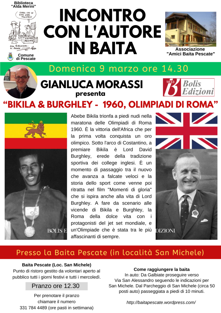 Domenica 9 marzo ore 14.30 presso la Baita Pescate in località San Michele si terrà l’incontro con l’autore Gianluca Morassi, che presenterà il suo lavoro “Bikila & Burghley – 1960, Olimpiadi di Roma”.