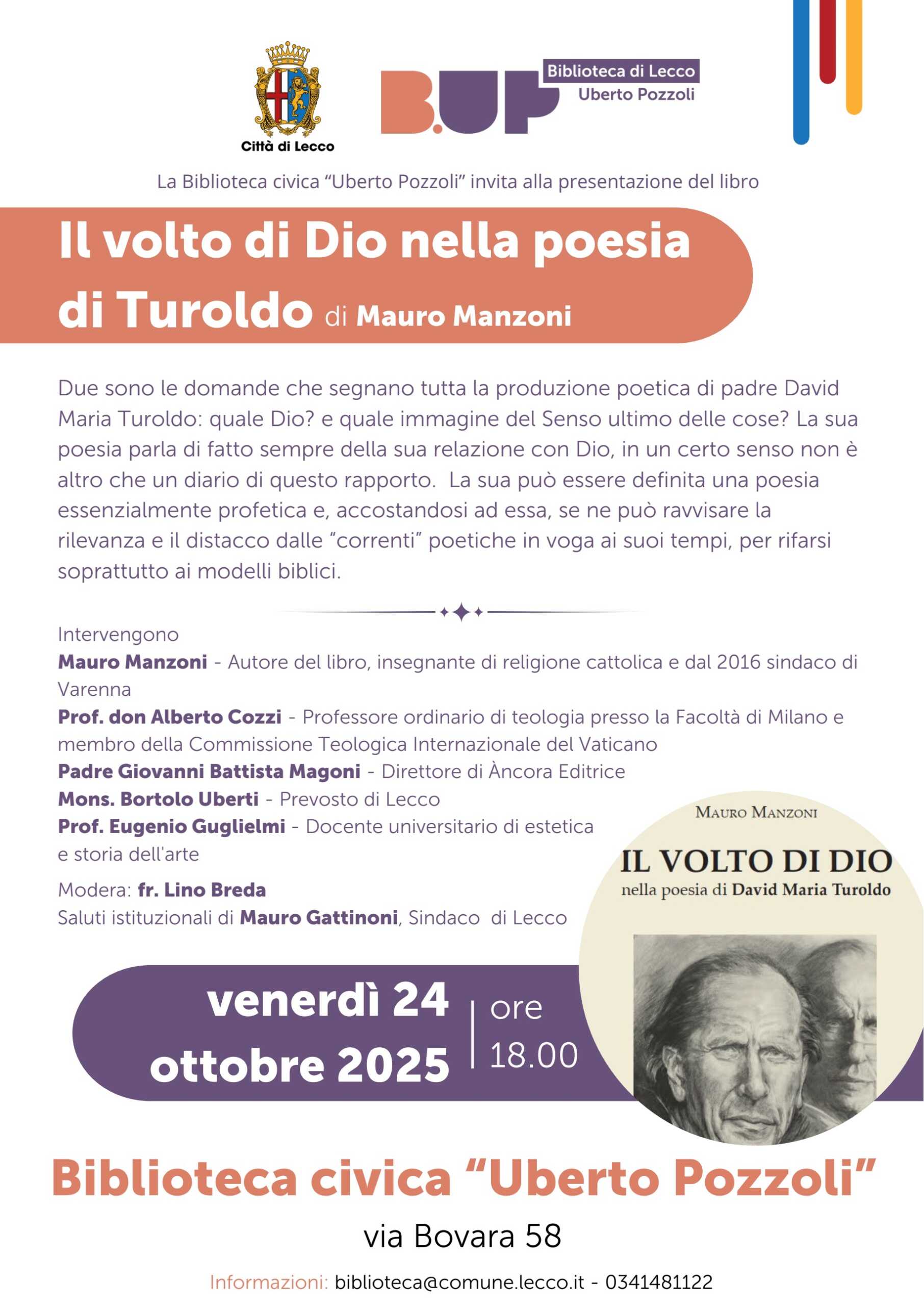 Si terrà Venerdì 24 Ottobre alle 18.00, presso la Biblioteca Civica di Lecco, l’incontro con l’autore Mauro Manzoni, il quale presenterà il suo libro Il volto di Dio nella poesia di David Maria Turoldo.