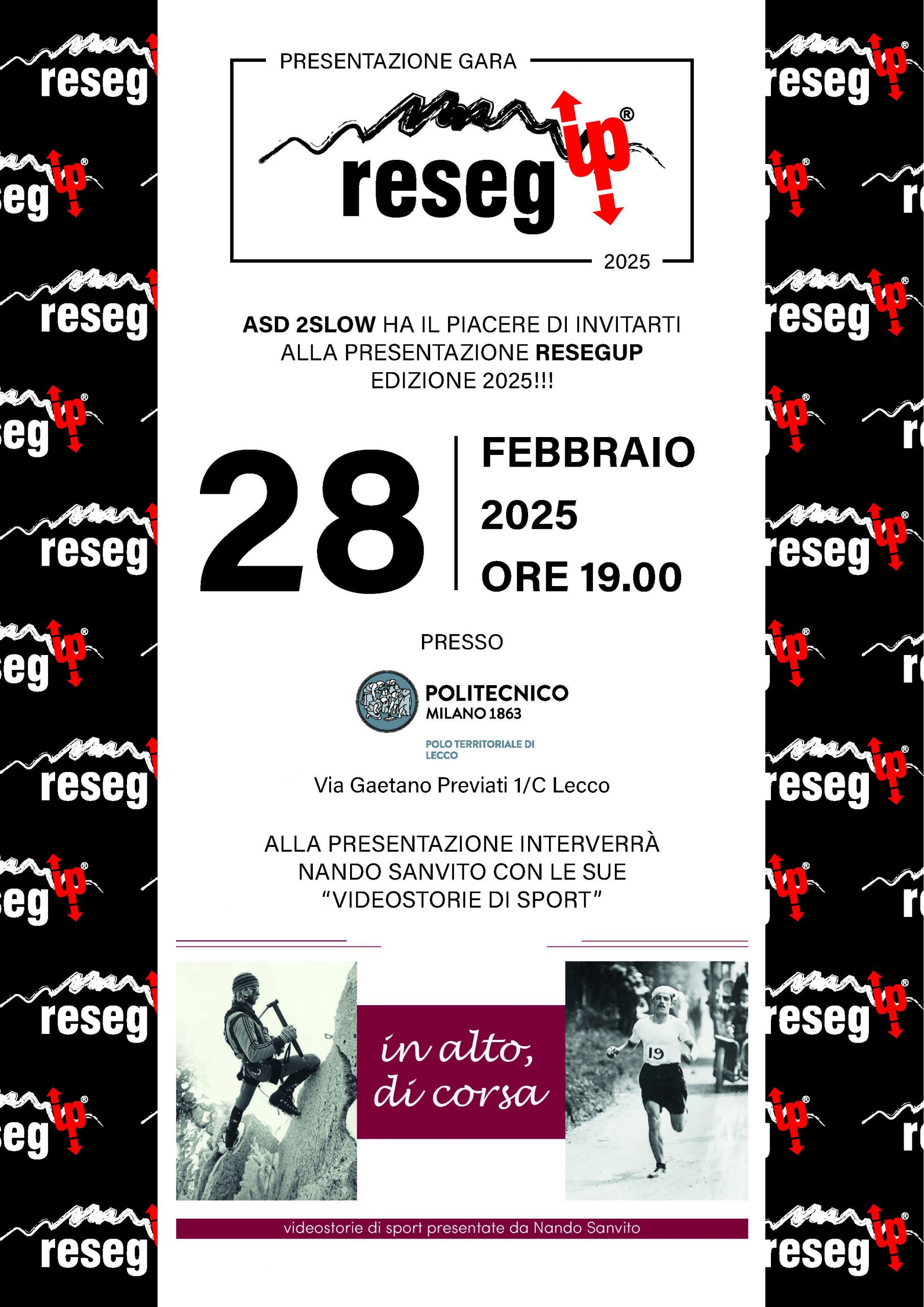 Il 28 Febbraio alle 19.00 si terrà la presentazione dellla Resegup 2025 presso il polo lecchese del Politecnico di Milano in Via Gaetano Previati 1/C. Alla presentazione interverrà Nando Sanvito presentando le sue “Videostorie di sport”.