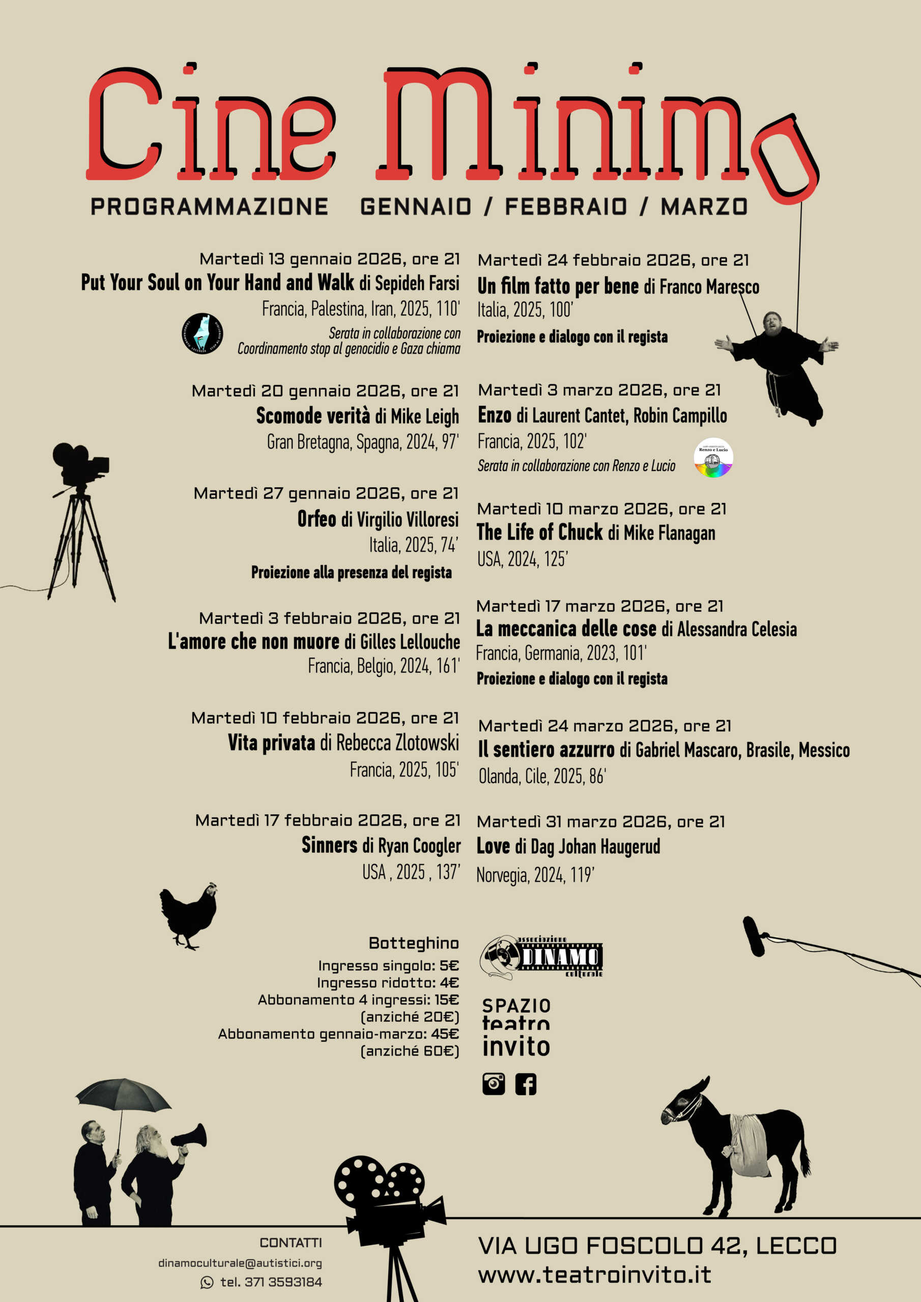 Riparte a Lecco la rassegna Cine Minimo, proposta culturale ormai riconoscibile per la sua attenzione al cinema d’autore internazionale e alle opere più significative del panorama contemporaneo. La nuova programmazione, ospitata allo Spazio Teatro Invito di Lecco accompagnerà il pubblico da gennaio a marzo con una selezione di film provenienti da tutto il mondo, arricchita da incontri con registi e serate speciali in collaborazione con realtà culturali del territorio.