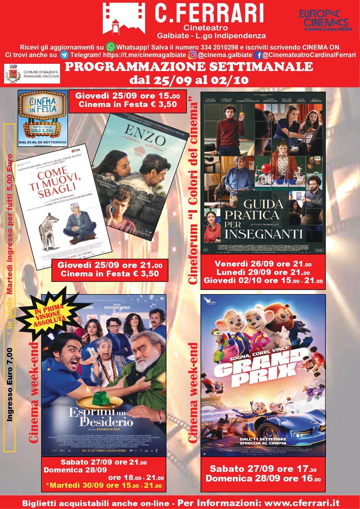 Di seguito la programmazione della settimana della sala “C. Ferrari” di Galbiate. ù