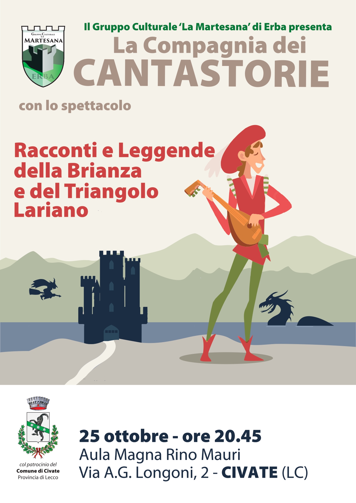 Sabato 25 Ottobre, alle 20.45, presso l’Aula Magna “Rino Mauri” a Civate, il Gruppo Culturale “La Martesana” di Erba andrà in scena con Racconti e Leggende della Brianza e del Triangolo Lariano, cantate e presentate con immagini come una volta. L’ingresso è libero.