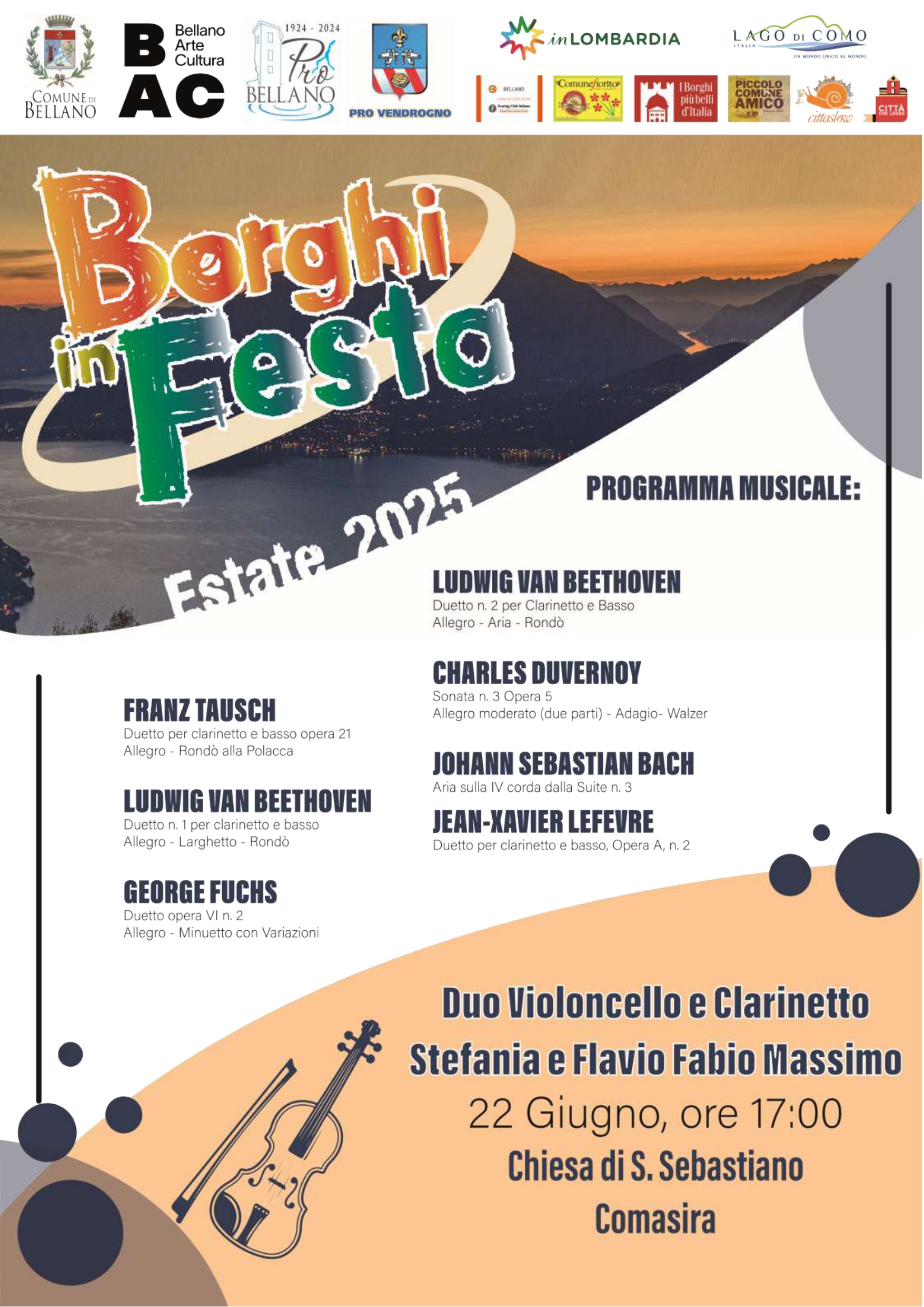 Domenica 22 giugno alle 17.00 a Comasira (frazione di Bellano) si svolgerà il primo concerto della rassegna “Borghi in festa” che coinvolge durante i mesi estivi tutte le frazioni bellanesi. A suonare sarà il duo di violoncello e clarinetto di Stefania e Flavio Fabio Massimo.