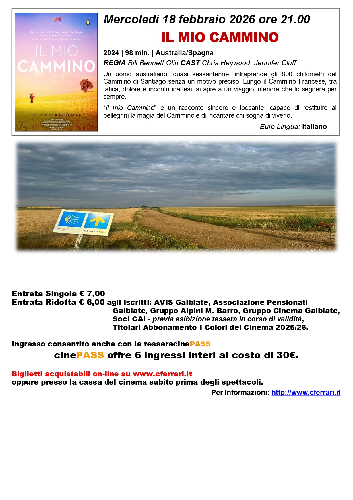 Dopo il tutto esaurito del 29 ottobre e le otto repliche che hanno registrato costantemente un grande successo di pubblico, torna in programmazione Il mio cammino (Australia/Spagna, 2024 – 98’), in proiezione mercoledì 18 febbraio alle 21.00. Diretto da Bill Bennett, il film racconta la storia di un uomo australiano, quasi sessantenne, che intraprende gli 800 chilometri del Cammino di Santiago senza un obiettivo preciso. Attraverso la fatica fisica, il dolore e gli incontri inattesi lungo il percorso, il viaggio si trasforma in un’intensa esperienza di ricerca interiore. Un racconto autentico e toccante, capace di restituire tutta la magia del Cammino e di parlare a chi sogna di viverlo in prima persona.