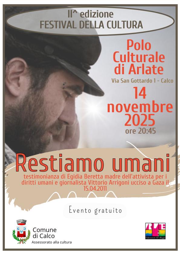 In occasione della 3° edizione del Festival della Cultura, il Comune di Calco organizza un evento dal titolo Restiamo Umani. L’evento si terrà presso il Polo Culturale di Arlate Venerdì 14 Novembre alle 20.45 e vedrà la partecipazione di Egidia Beretta, madre di Vittorio Arrigoni, attivista per i diritti umani ucciso a Gaza il 15 aprile 2011. L’evento è gratuito.