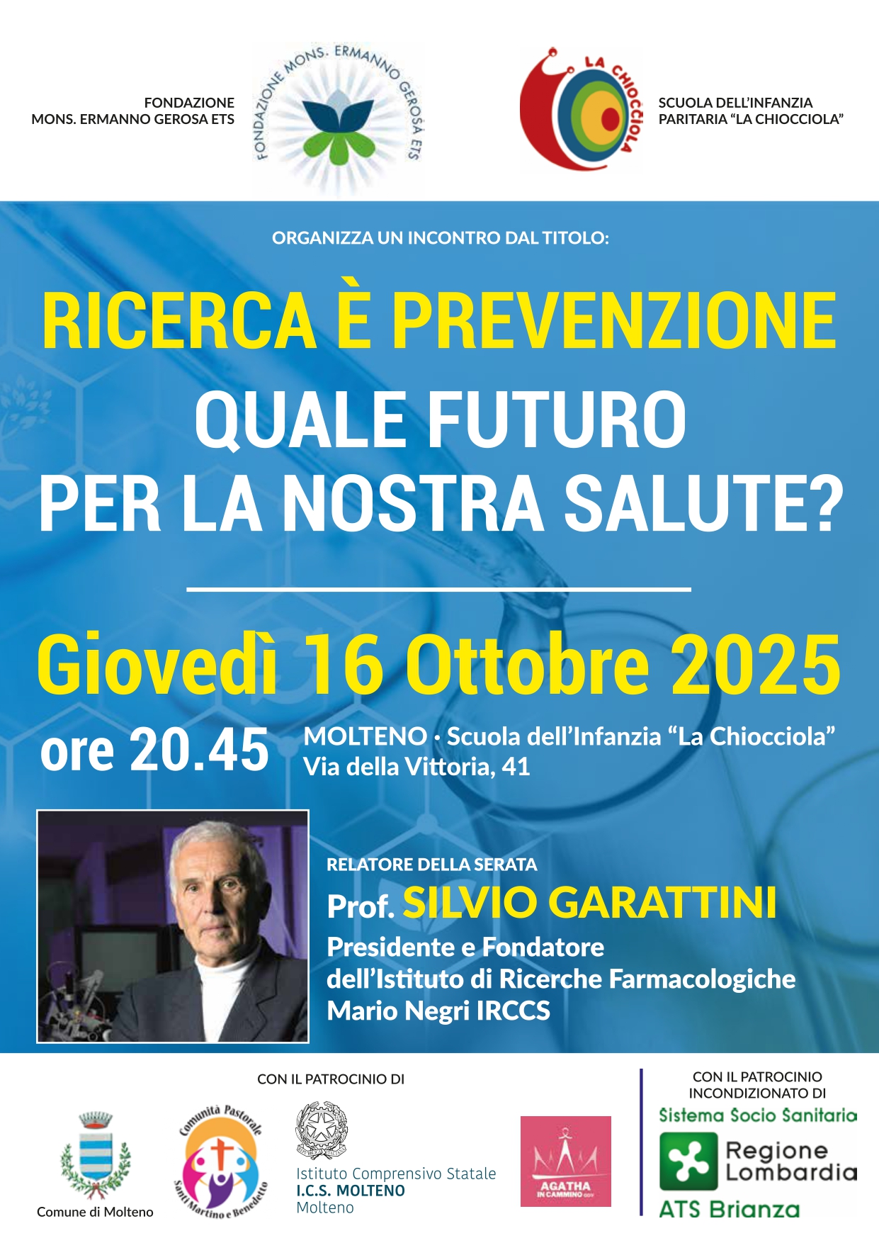 La Fondazione Monsignor Ermanno Gerosa Ets, Ente gestore della Scuola dell’infanzia paritaria “La Chiocciola” a Molteno, promuove ed organizza per Giovedì 16 Ottobre, alle 20.45, un incontro con il Professore Silvio Garattini, Presidente e Fondatore dell’Istituto di Ricerche Farmacologiche Mario Negri IRCCS. L’incontro ha il titolo: Ricerca è prevenzione. Quale futuro per la nostra salute?