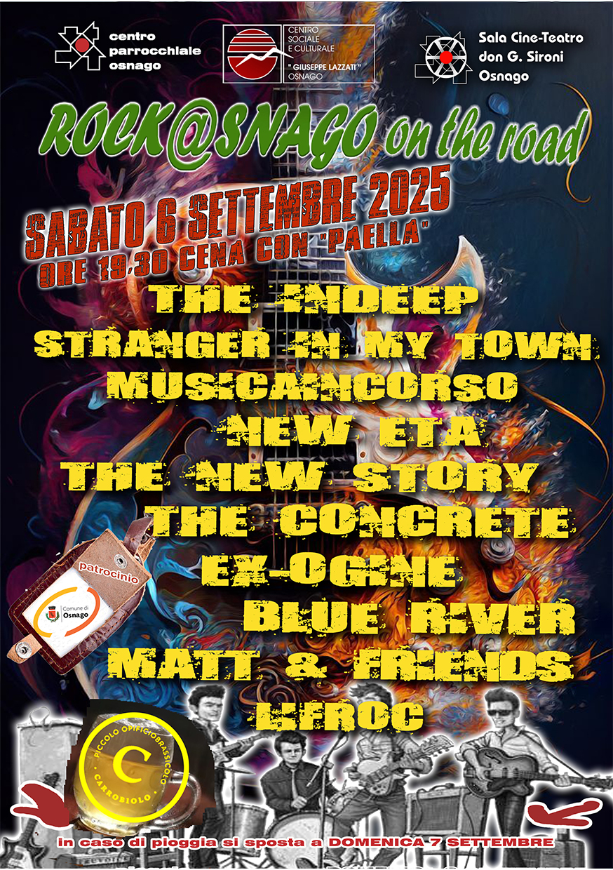 Sabato 6 Settembre, dalle ore 19.00, tre piazze di Osnago, in contemporanea, diventano palchi, con dieci gruppi musicali divisi sui tre punti, e ognuno con il suo genere, il pubblico avrà la possibilità di poter assistere ad un evento che porta a conoscere le realtà musicali del nostro territorio.